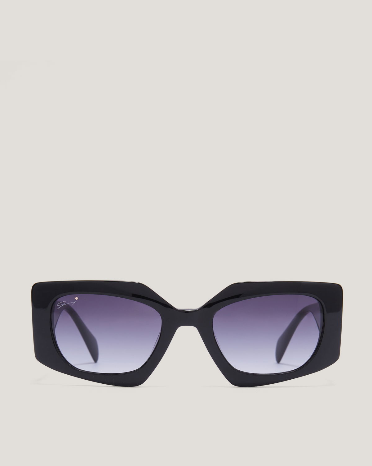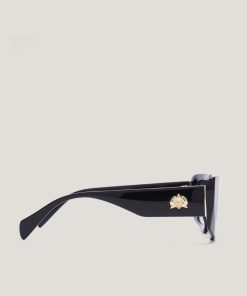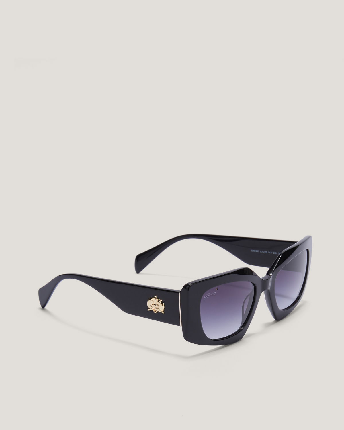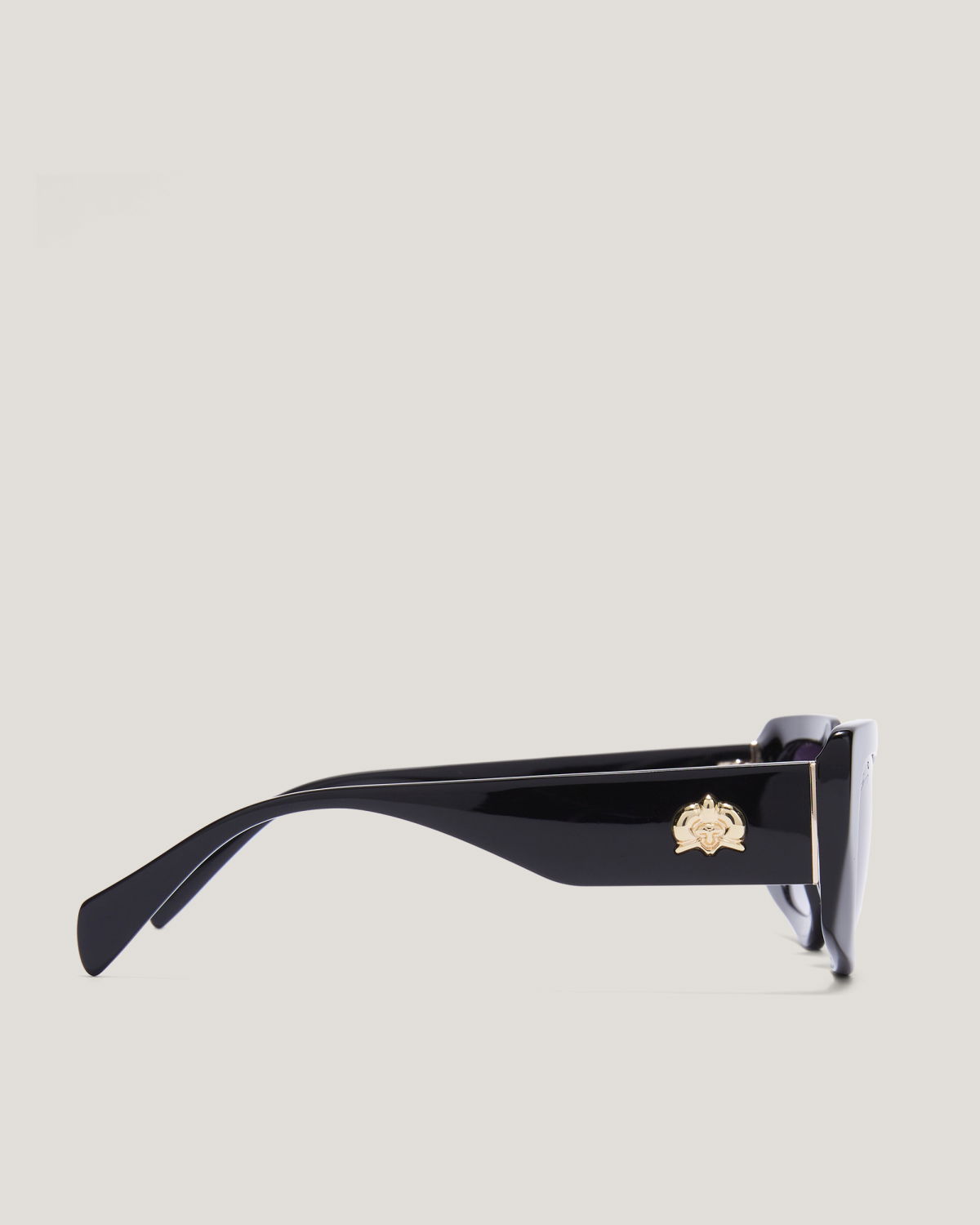These square sunglasses, made with a black frame and golden metal details featuring an orchid, a symbol of the Maison. They boast a modern design with elegant lines. The lilac gradient lenses add a touch of originality.