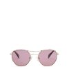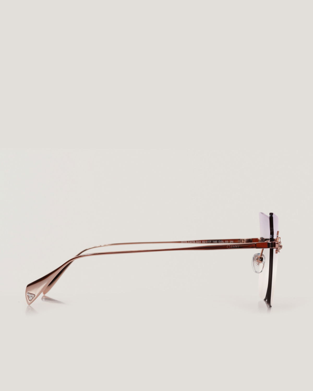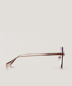 Genny sunglasses with a minimalist gold metal frame and dark lenses, featuring a sophisticated and elegant cat-eye design. The slim temples are adorned with distinctive details, including the iconic three-dimensional orchid symbol, embodying femininity and refinement. The uniquely shaped lenses add a modern and glamorous touch, ideal for completing luxurious looks.