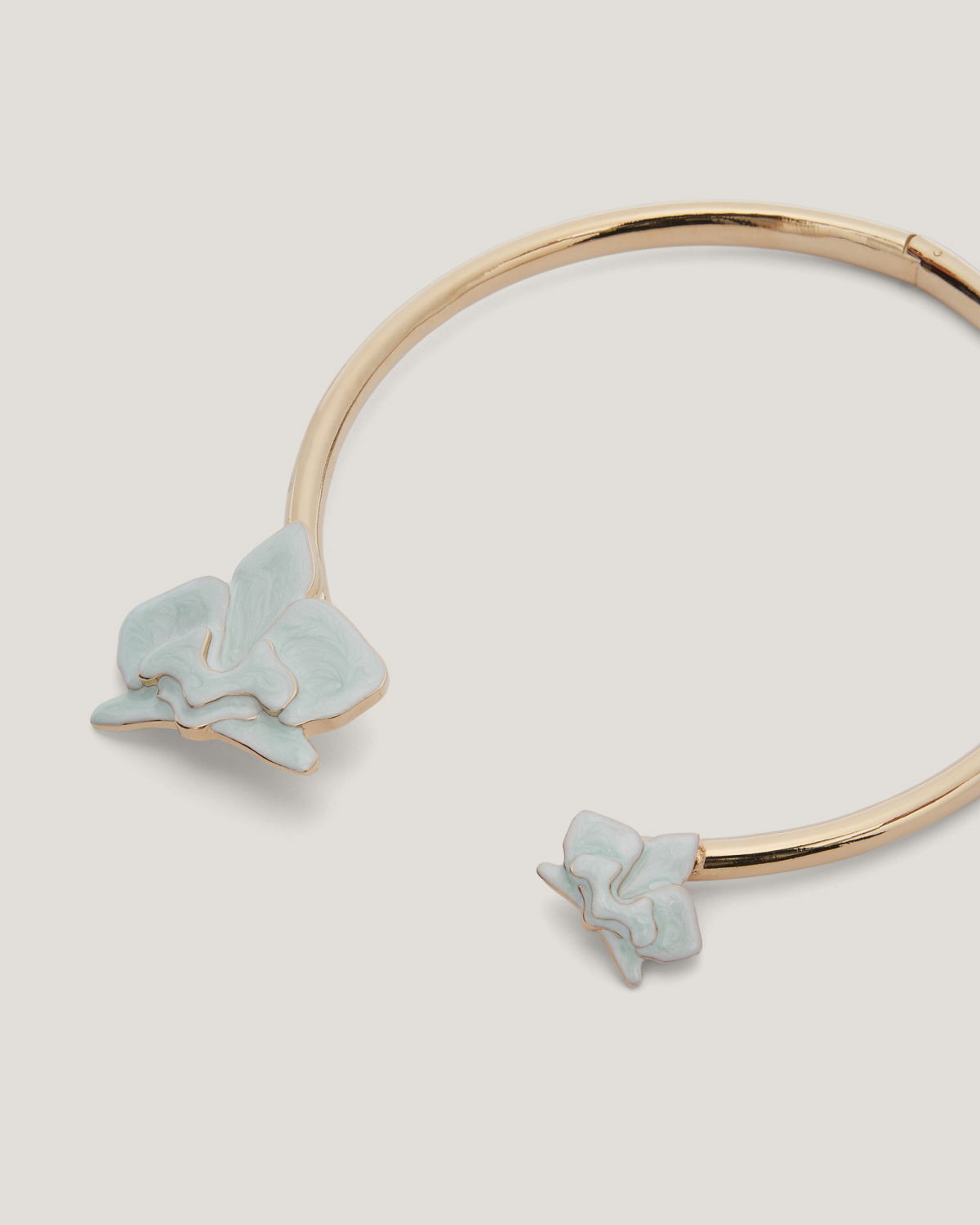 This elegant necklace is adorned with delicate orchids at both ends, crafted in polished brass that beautifully reflects the light. The minimalist design adds a touch of sophistication to any look, while the subtle floral detail brings a unique and feminine touch. The open-ended structure makes it easy to wear and style, perfect for both day and evening looks.