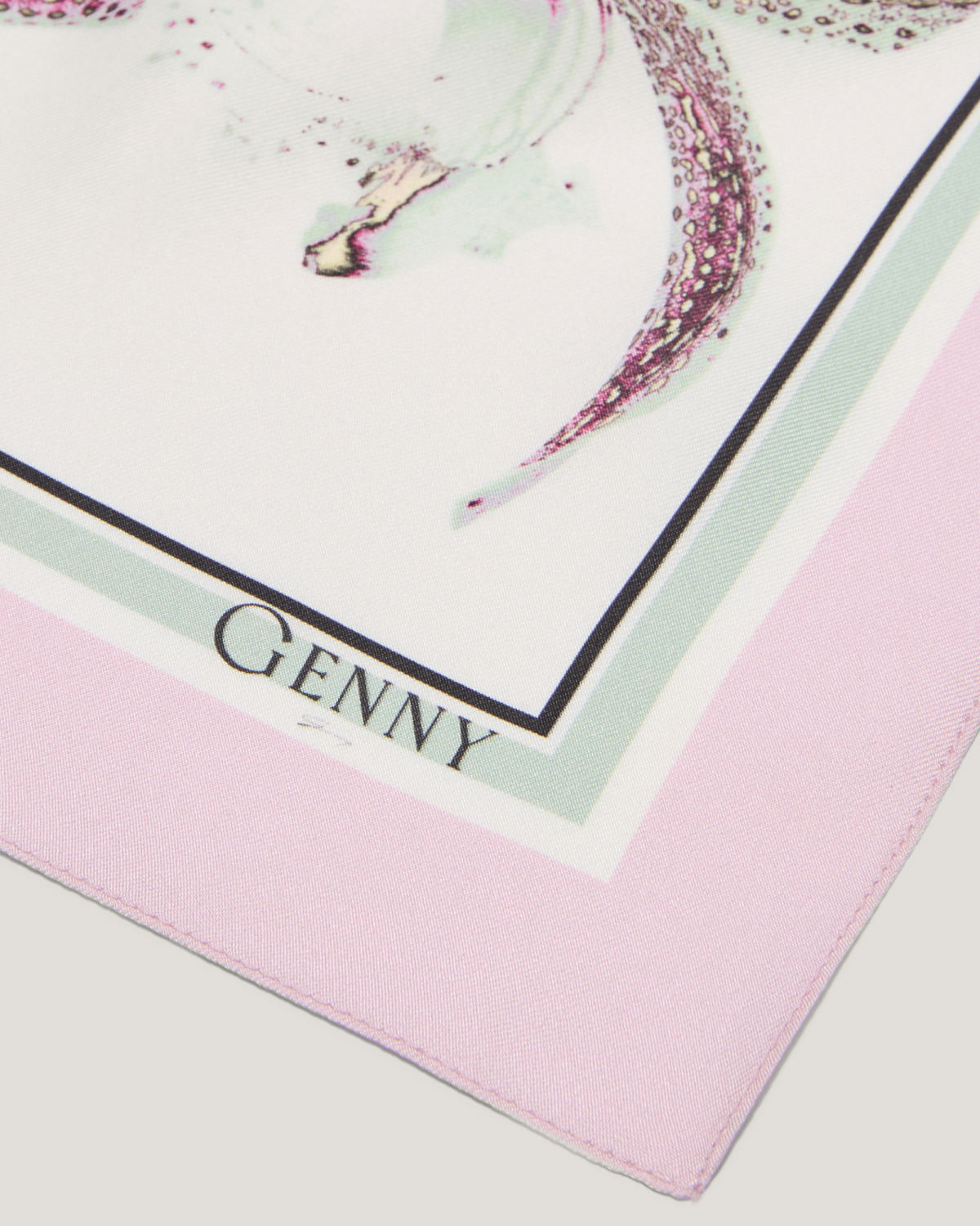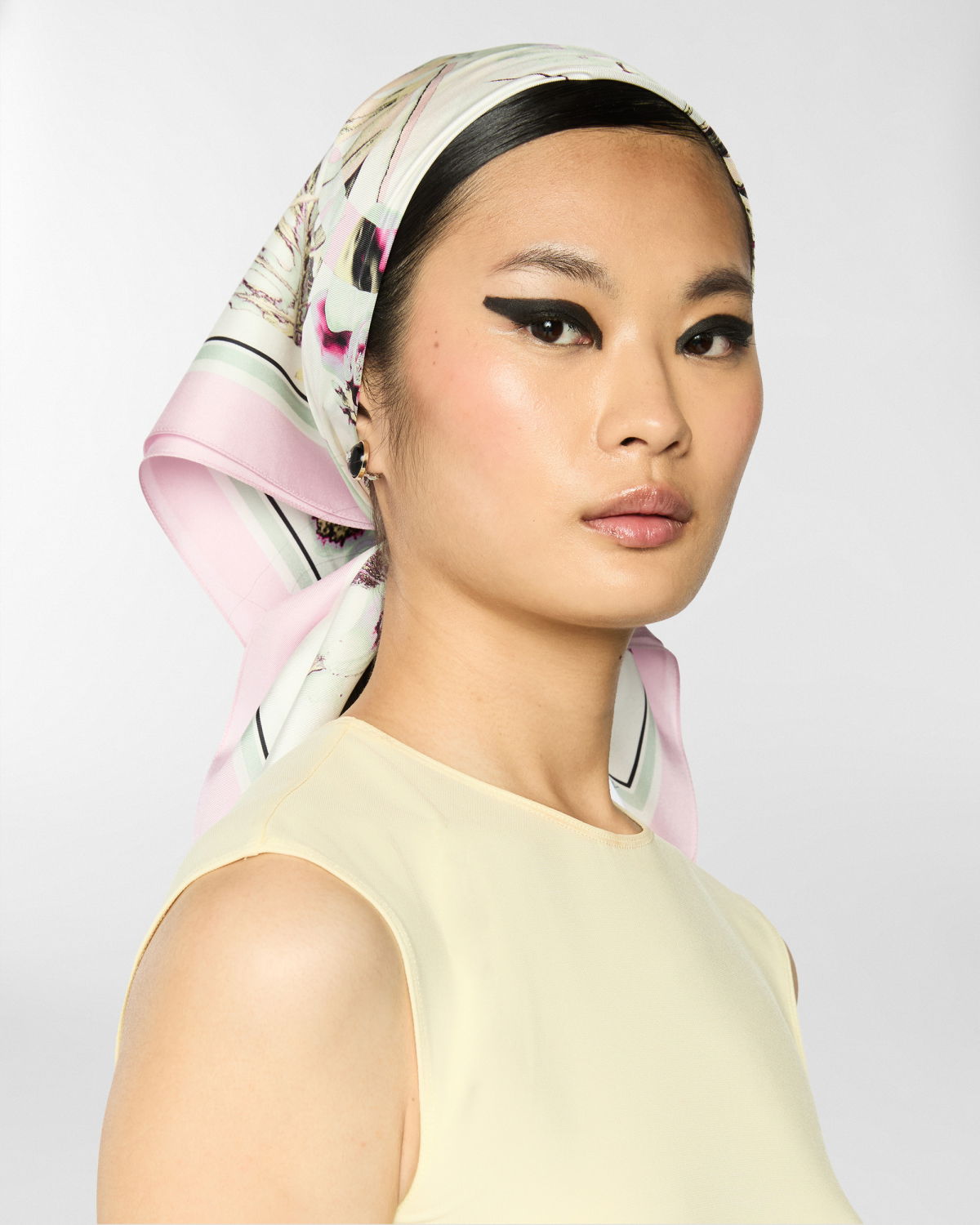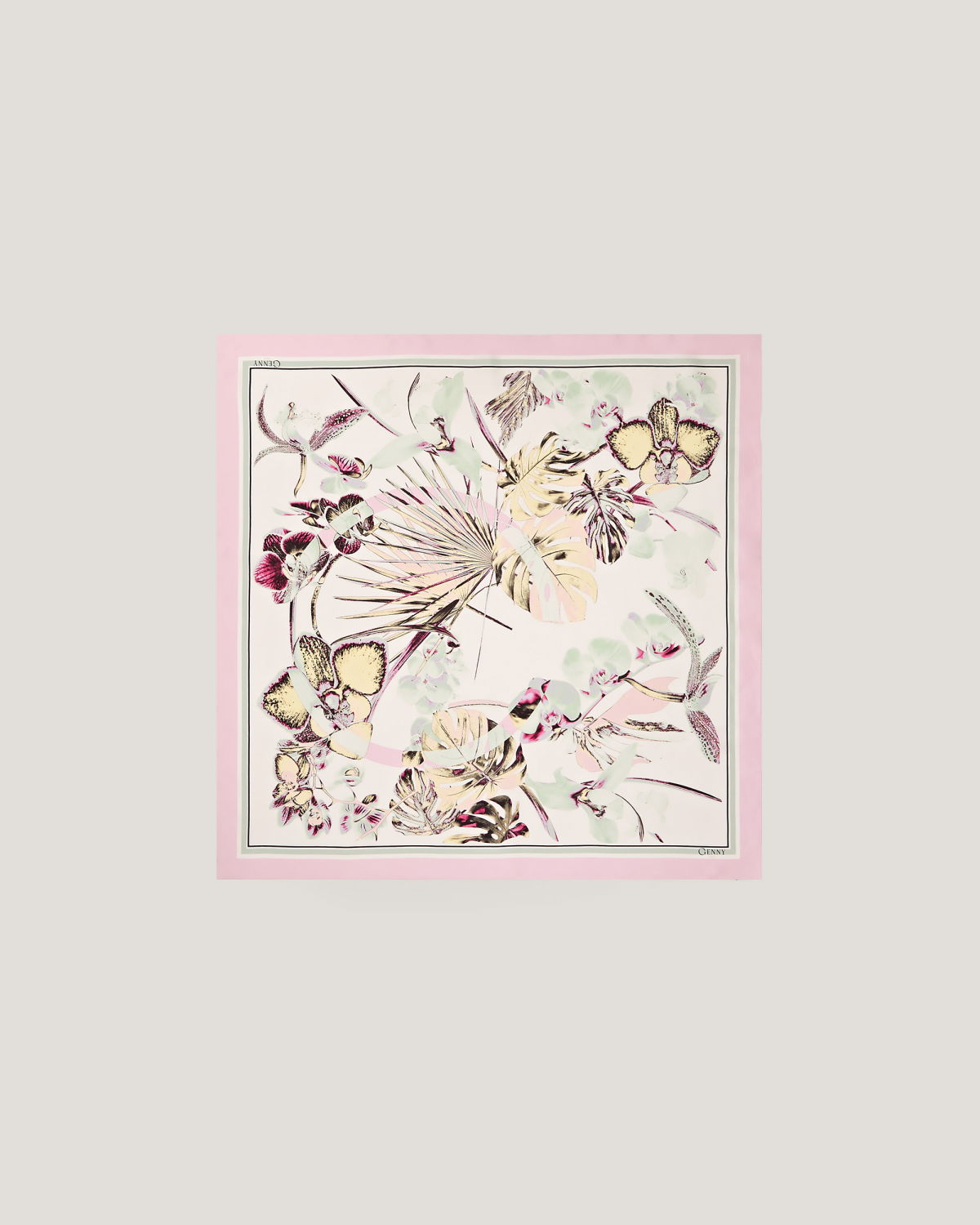 A luxurious silk scarf celebrating nature with its vibrant Jungle Orchids print, blending exotic floral motifs with soft color palettes. Made from high-quality silk, it offers a soft and luminous texture, perfect for adding a touch of elegance and femininity to any outfit. This versatile accessory is ideal for wearing around the neck, as a hairpiece, or as a decorative detail for bags. Perfect for those seeking a sophisticated and natural style.