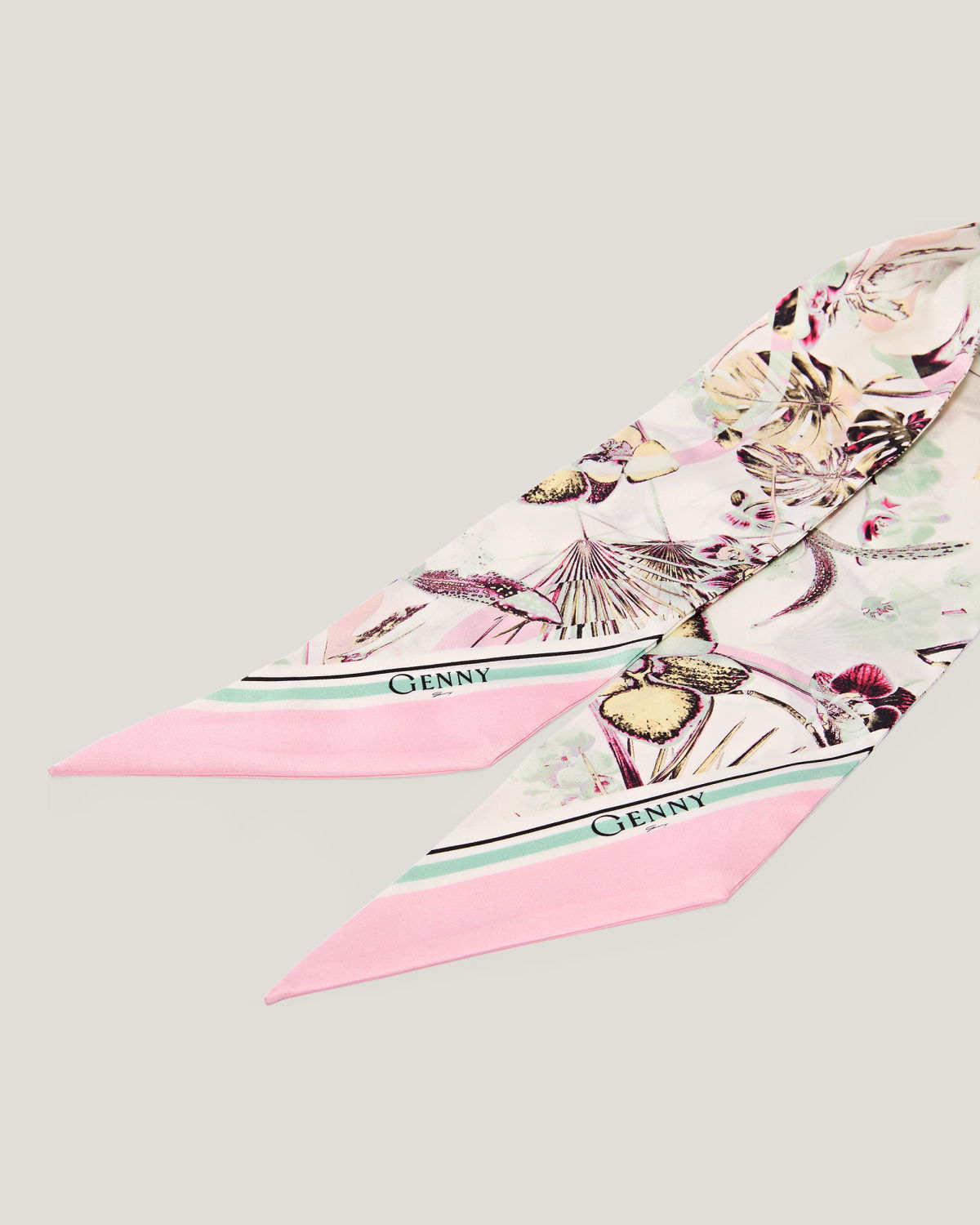 The silk charm scarf with Jungle Orchids print is an elegant and versatile accessory, perfect for enhancing any look with a unique touch of style. Made from pure silk, it features a floral pattern inspired by the vibrancy of the jungle and a sophisticated color palette. The shiny metal chain weave and practical lobster clasp make it ideal for decorating bags, belts, or other accessories. With dimensions of 21 x 33 cm, it embodies the exquisite craftsmanship and design of Genny.