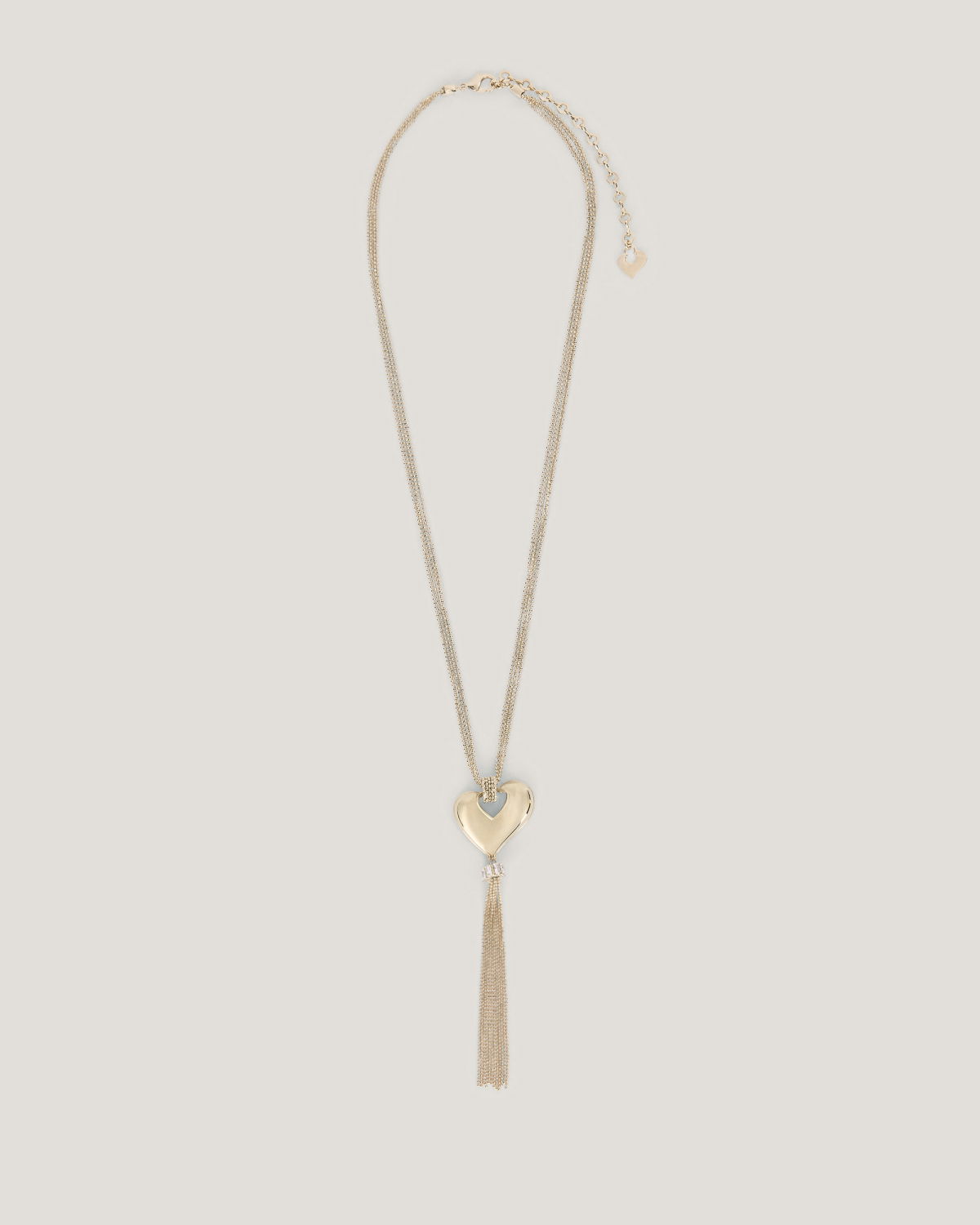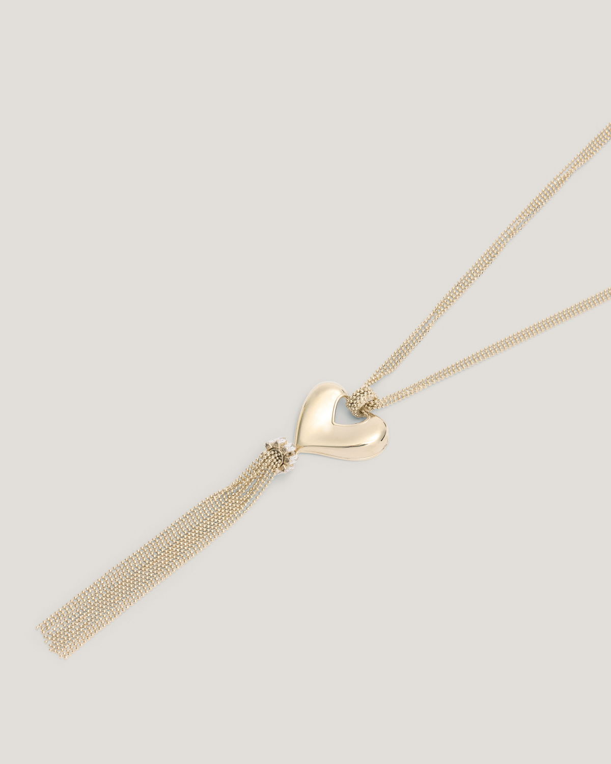 A sensuous long necklace featuring a polished gold-tone heart pendant, adorned with radiant details and a tassel made of fine chain strands. Its elongated silhouette and luminous finish make it the perfect accessory to elevate eveningwear or refined, modern ensembles.