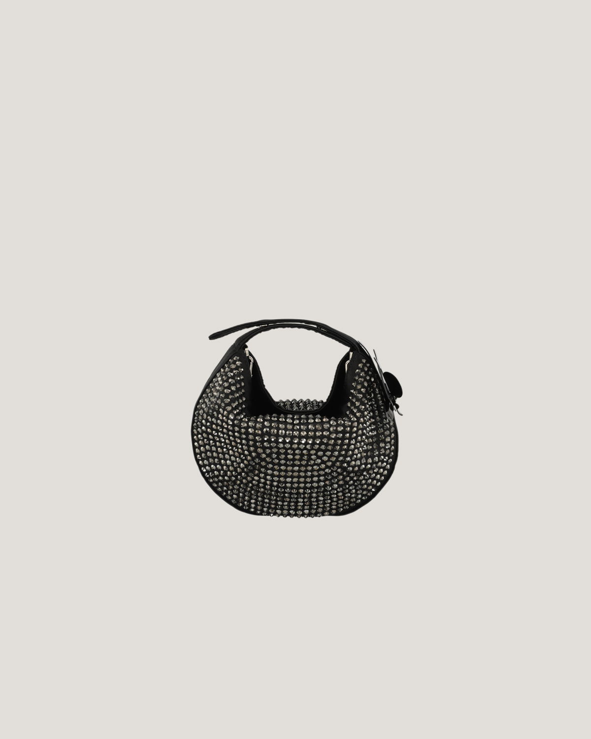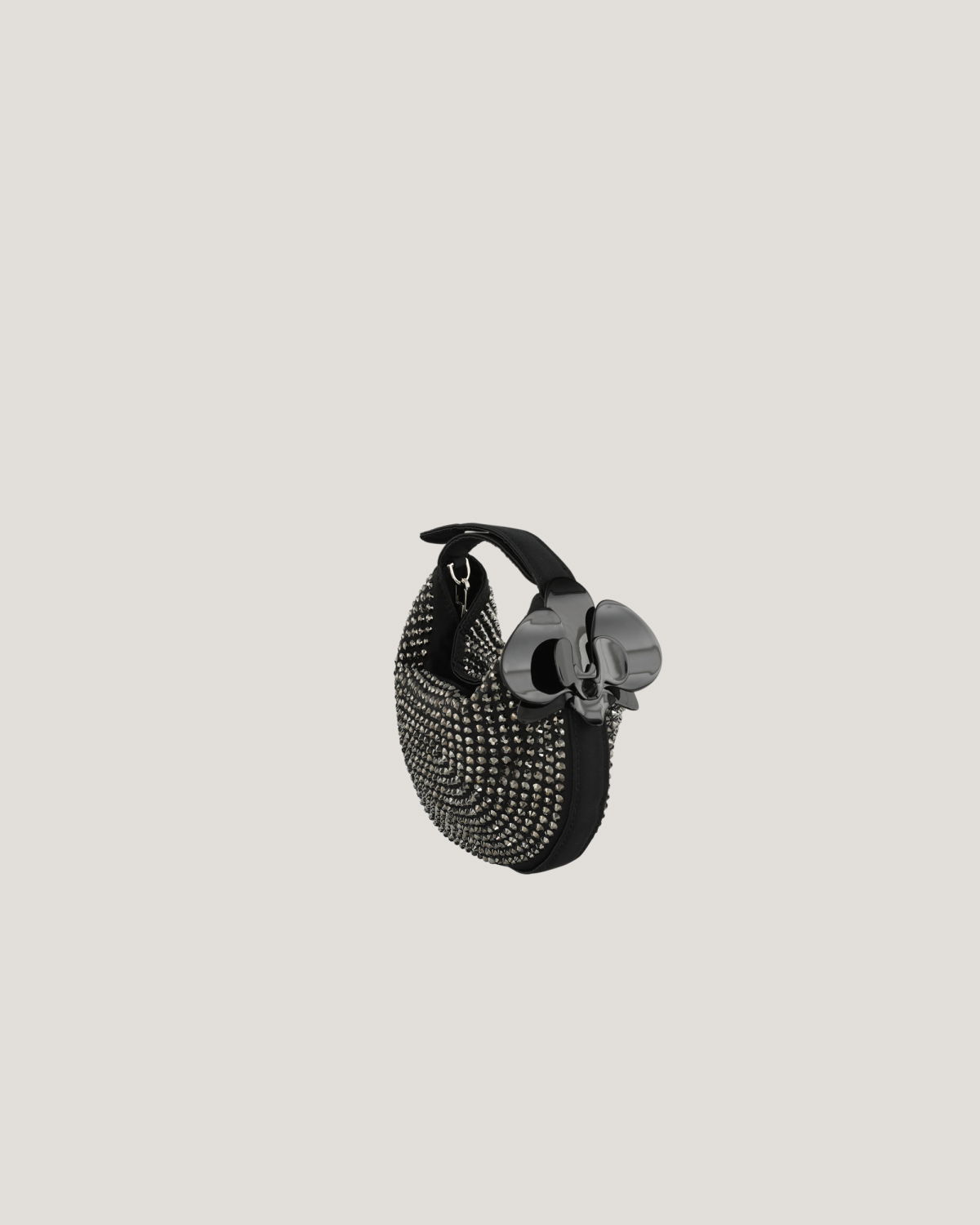 Bold glamour and iconic details come together in the Fortune bag. The mini silhouette, entirely covered in rhinestones, reflects the light with every movement. The rigid handle is adorned with the Maison’s signature orchid flower in a polished mirrored metal finish. Equipped with a detachable and adjustable chain strap, it can be carried by hand, on the shoulder or crossbody. Perfect for evening looks and special occasions.