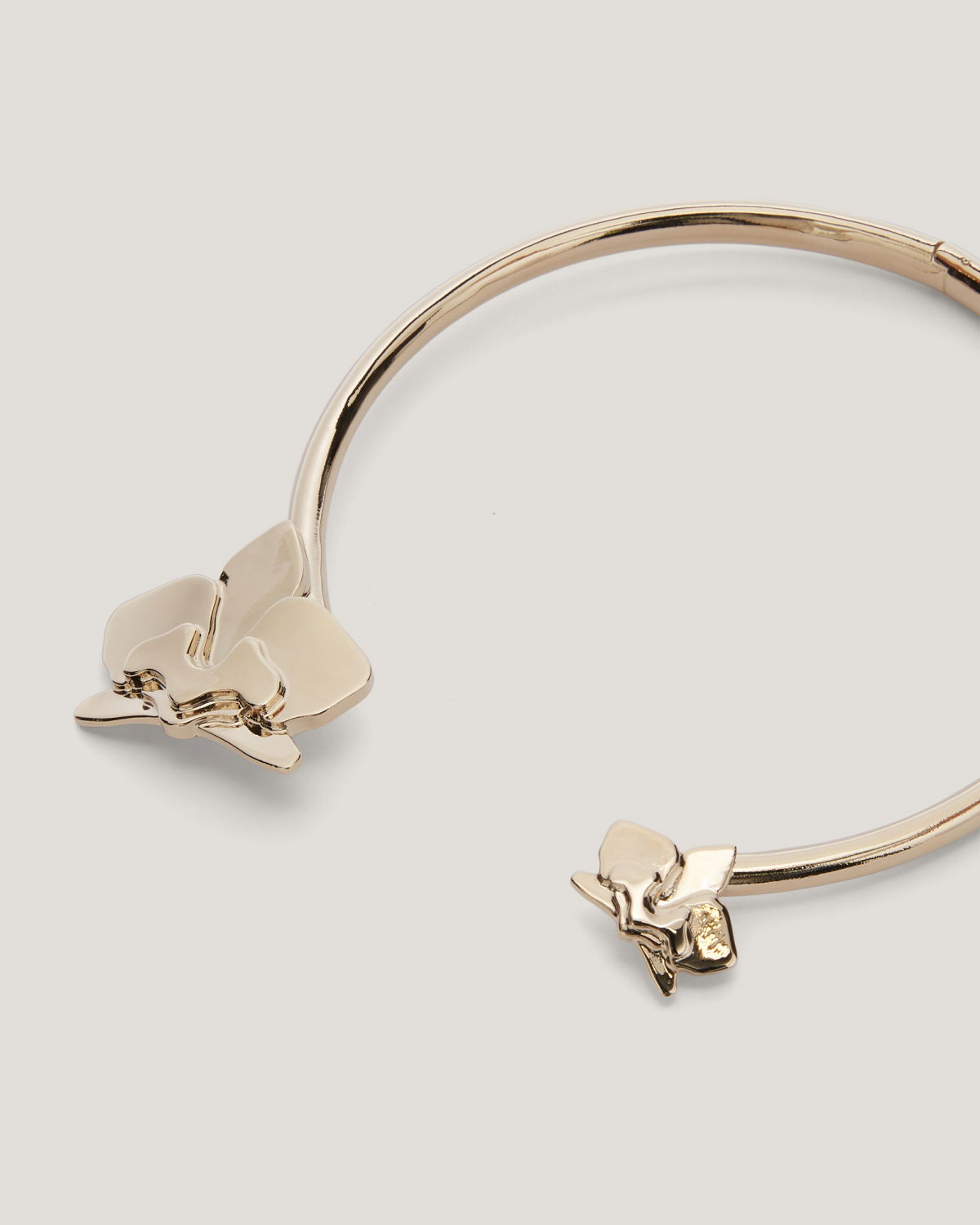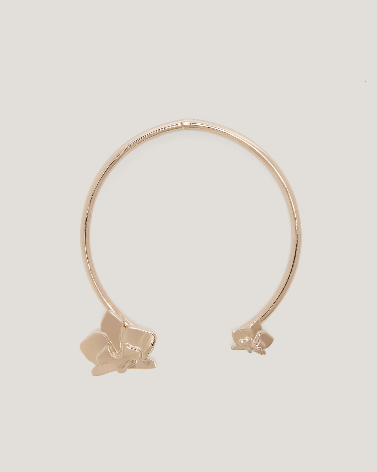 This elegant necklace is adorned with delicate orchids at both ends, crafted in polished metal that beautifully reflects the light. The minimalist design adds a touch of sophistication to any look, while the subtle floral detail brings a unique and feminine touch. The open-ended structure makes it easy to wear and style, perfect for both day and evening looks. A statement piece for those who love refined elegance with a modern twist.