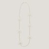 This elegant necklace is adorned with delicate orchids at both ends, crafted in polished metal that beautifully reflects the light. The minimalist design adds a touch of sophistication to any look, while the subtle floral detail brings a unique and feminine touch. The open-ended structure makes it easy to wear and style, perfect for both day and evening looks. A statement piece for those who love refined elegance with a modern twist.