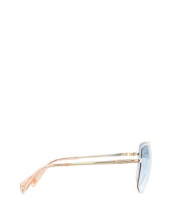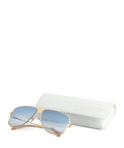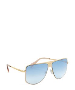 With their feminine and easy-to-wear style, the aviator sunglasses are great to pair with any look. The temples start a shining triangle that gives this piece an iconic twist. Moreover, the temples are surrounded by an elegant golden profile. The lenses are light blue.