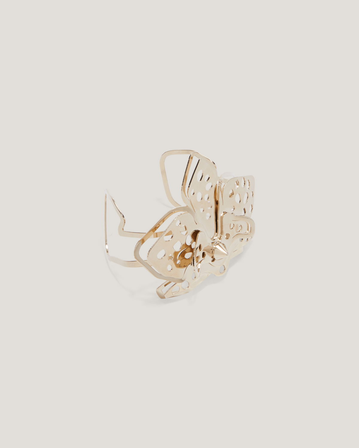 The maxi bracelet features an intricate design with a three-layered perforated orchid for a three-dimensional effect. The petals are meticulously handcrafted for precise folding.