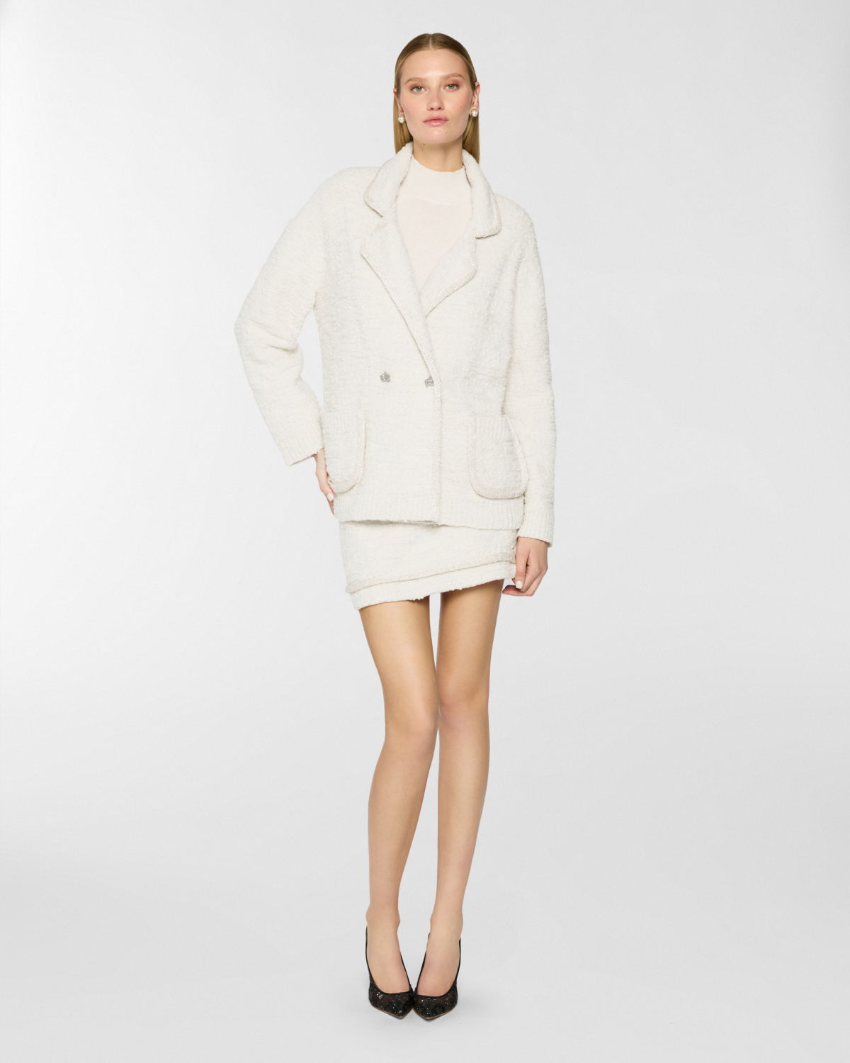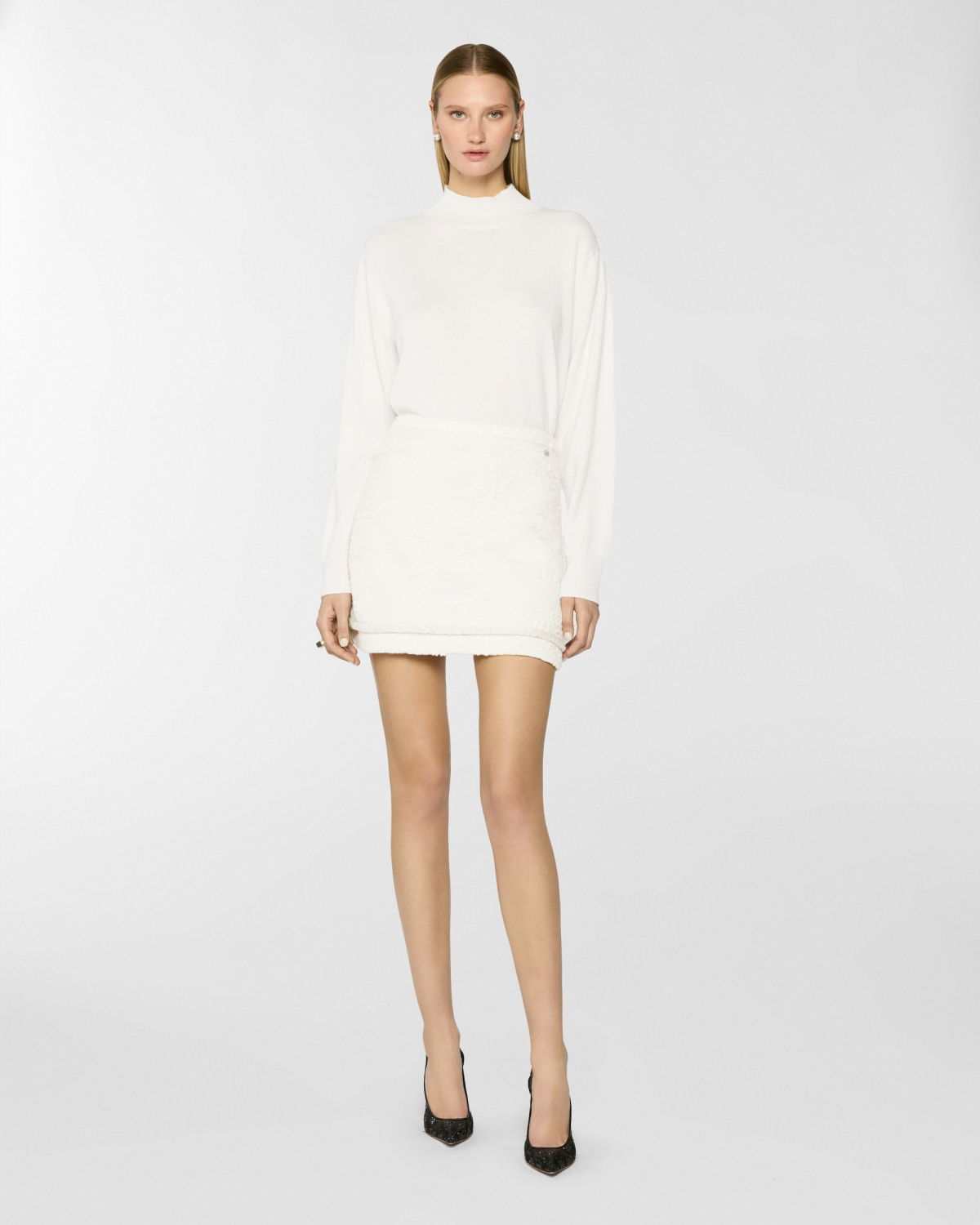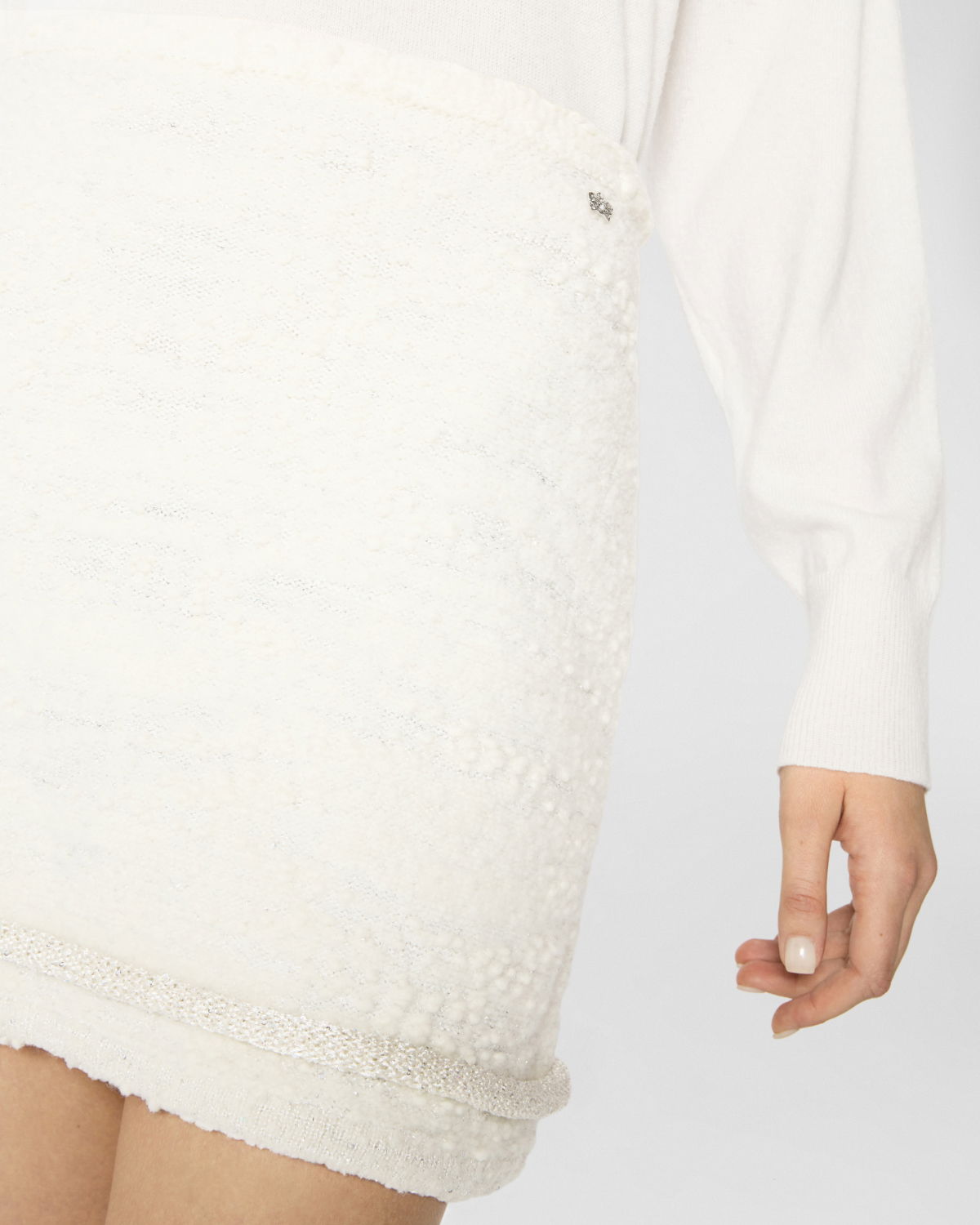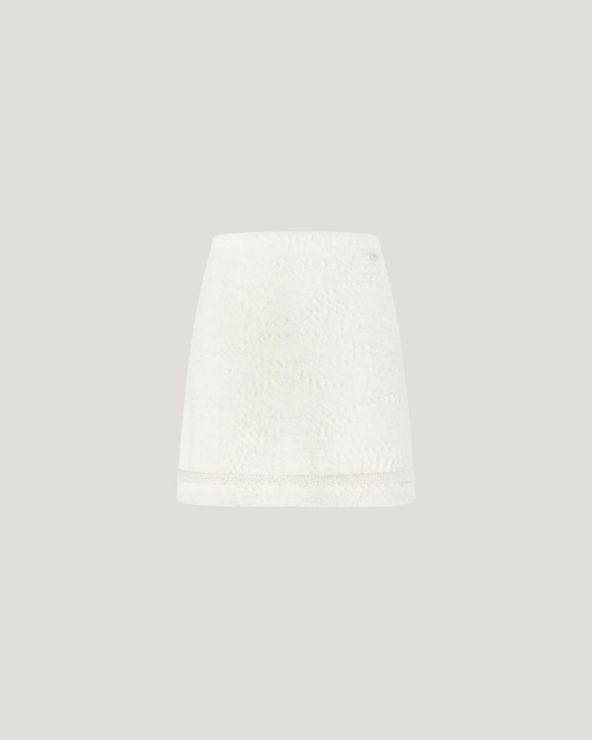 Mini skirt crafted from fine bouclé knit, featuring a three-dimensional, delicately irregular texture that gently embraces the silhouette with a close fit.