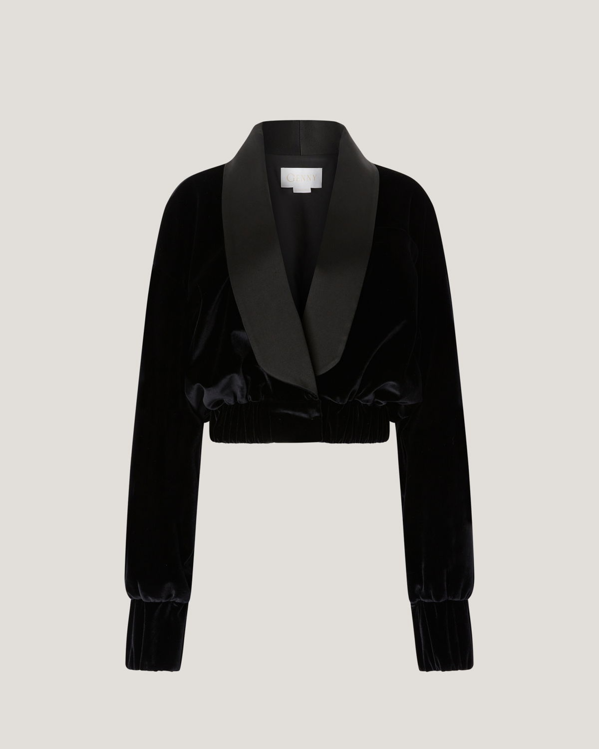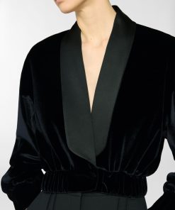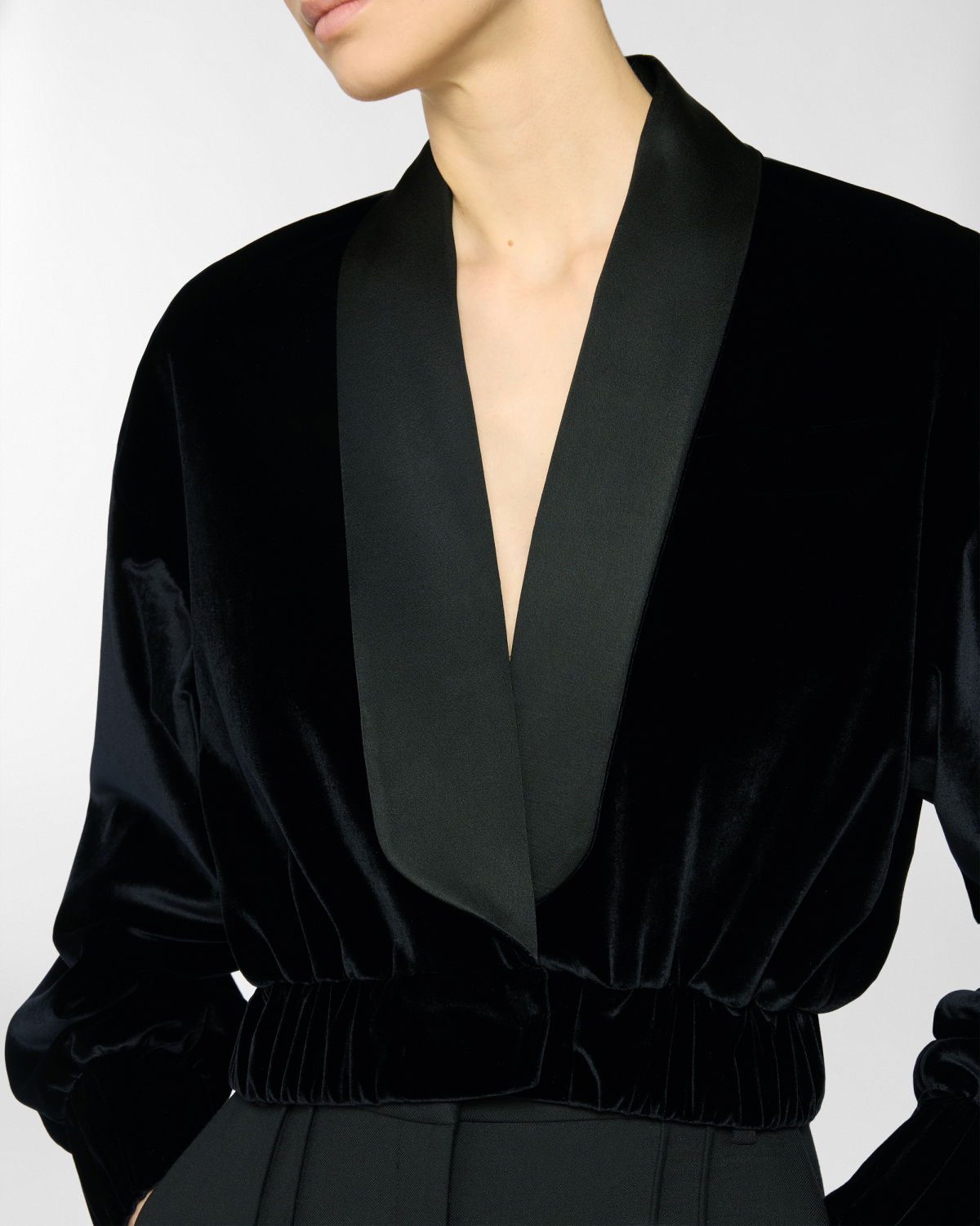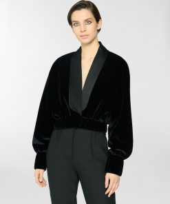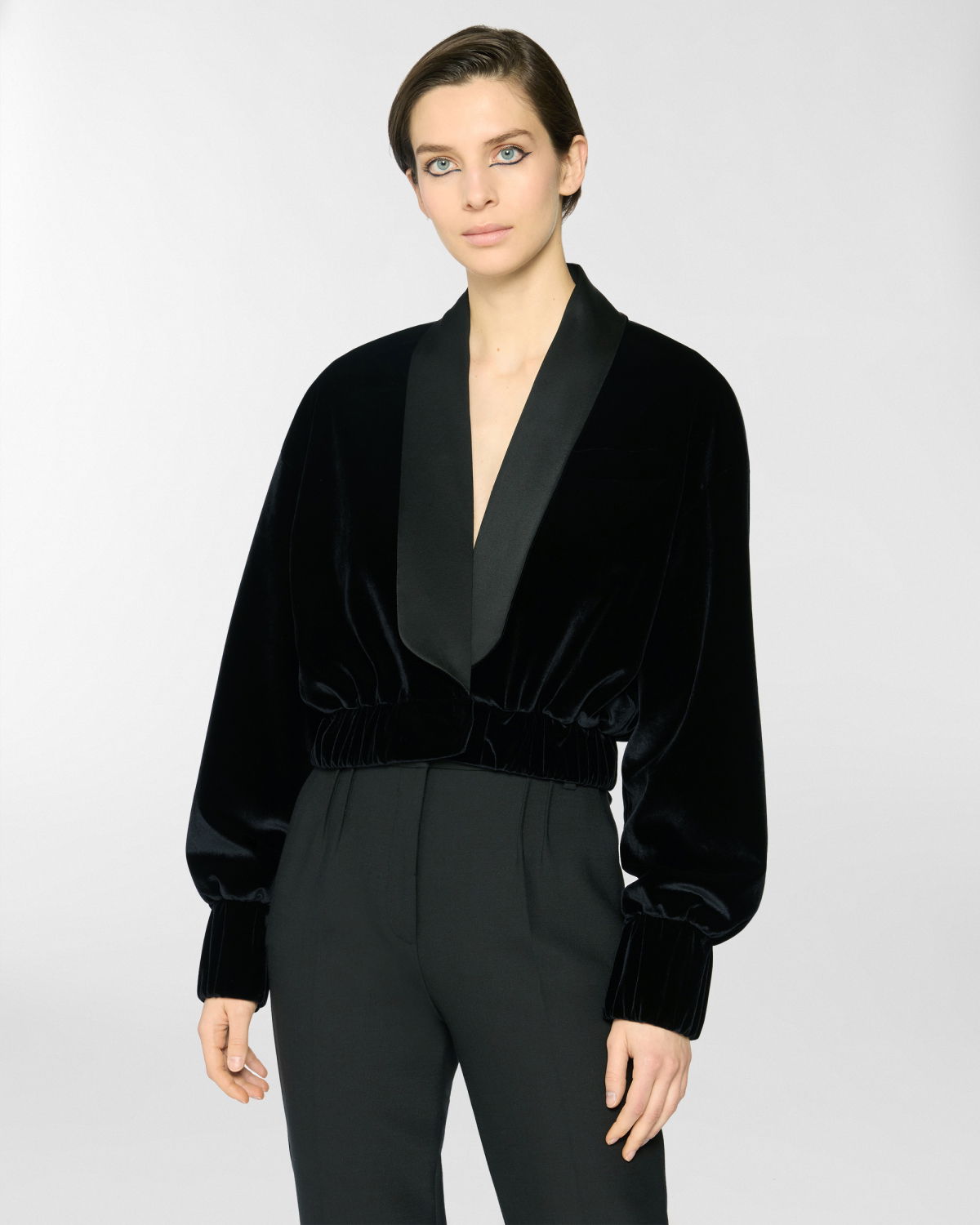Short jacket in smooth velvet with a contrasting satin shawl collar. The voluminous sleeves are balanced by an elasticated hem that defines the waistline. Structured velvet cuffs and a front closure with an invisible hook complete the design. Perfect for evening wear or to add character to a daytime look.