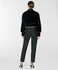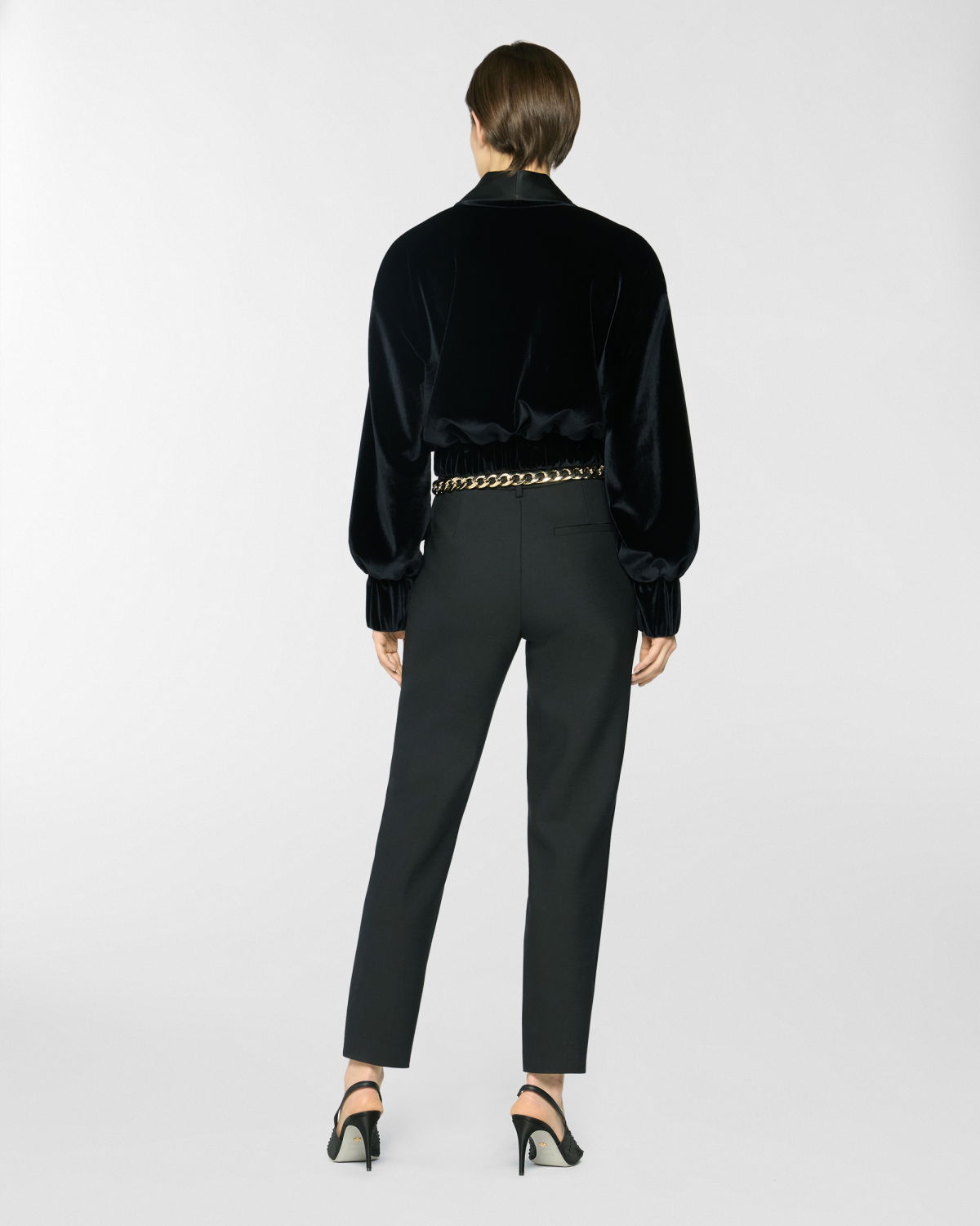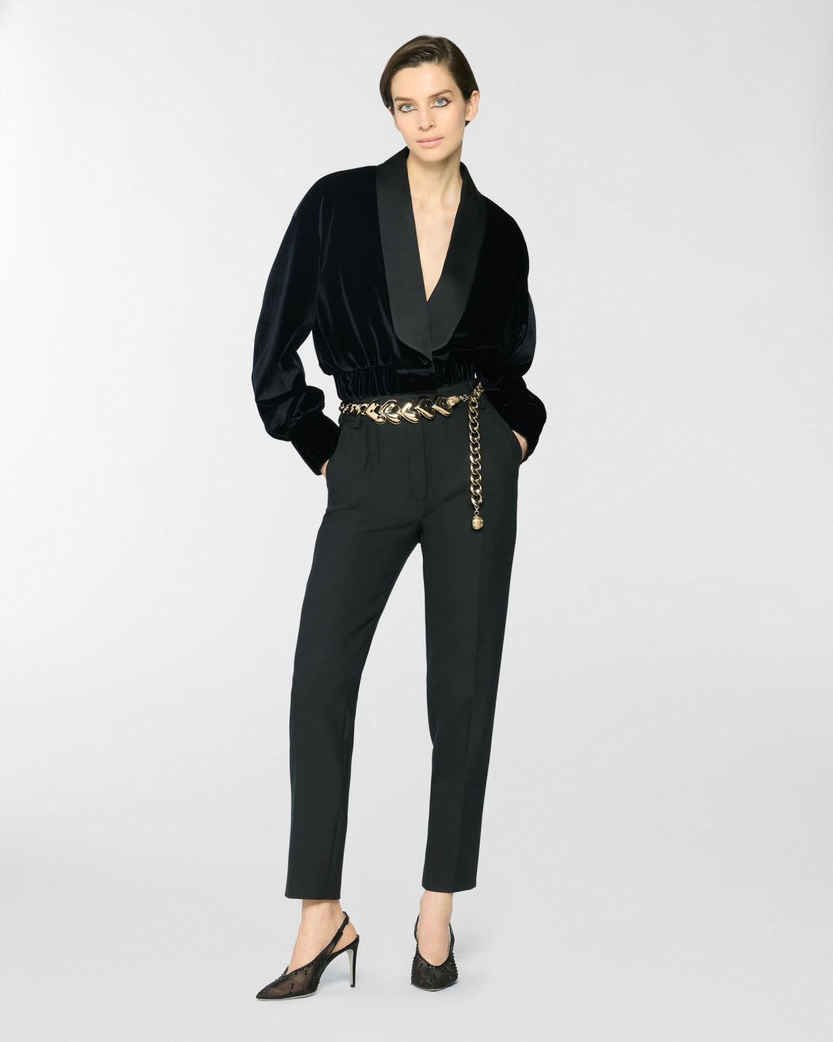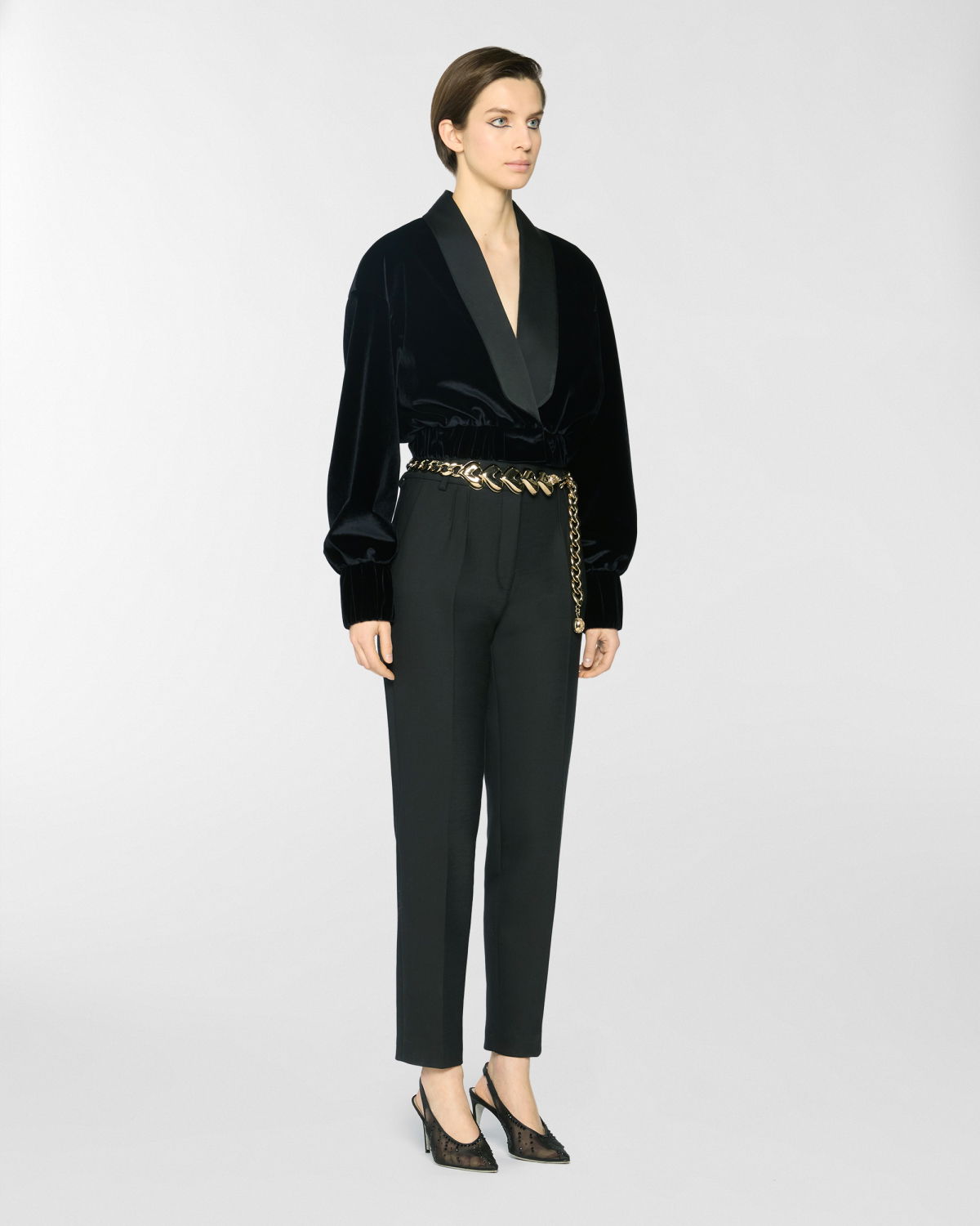 Short jacket in smooth velvet with a contrasting satin shawl collar. The voluminous sleeves are balanced by an elasticated hem that defines the waistline. Structured velvet cuffs and a front closure with an invisible hook complete the design. Perfect for evening wear or to add character to a daytime look.