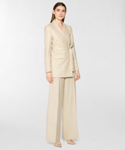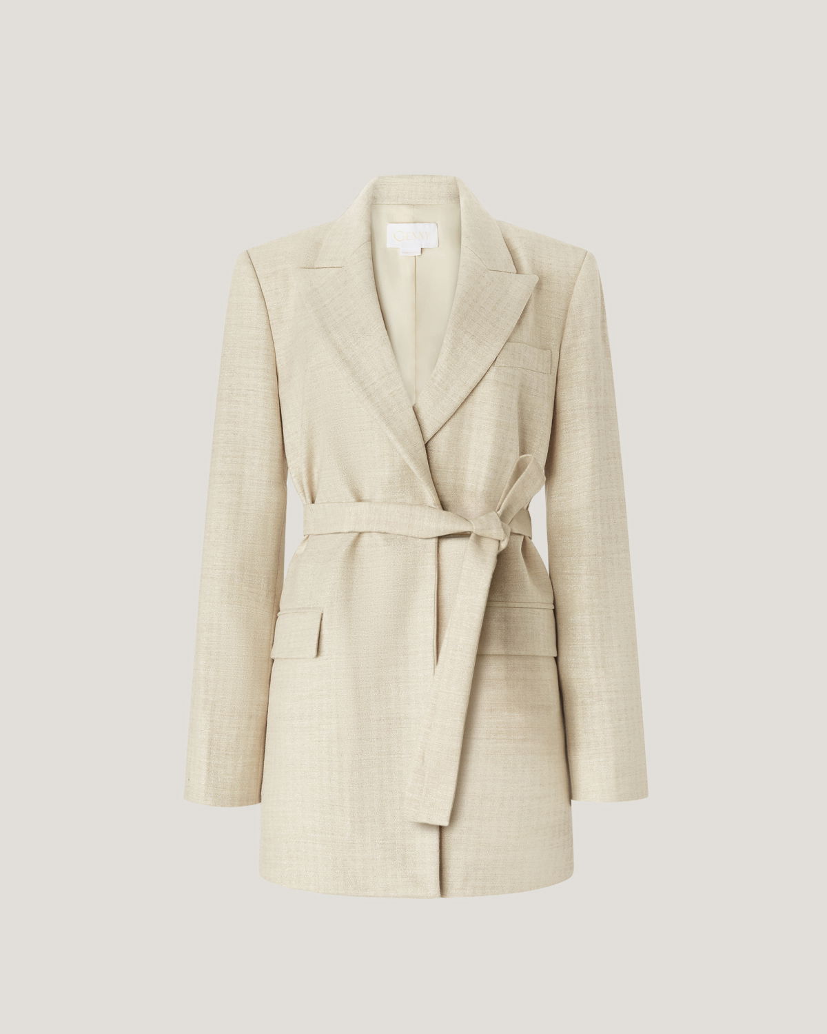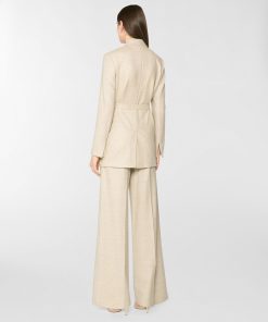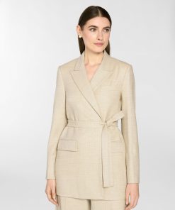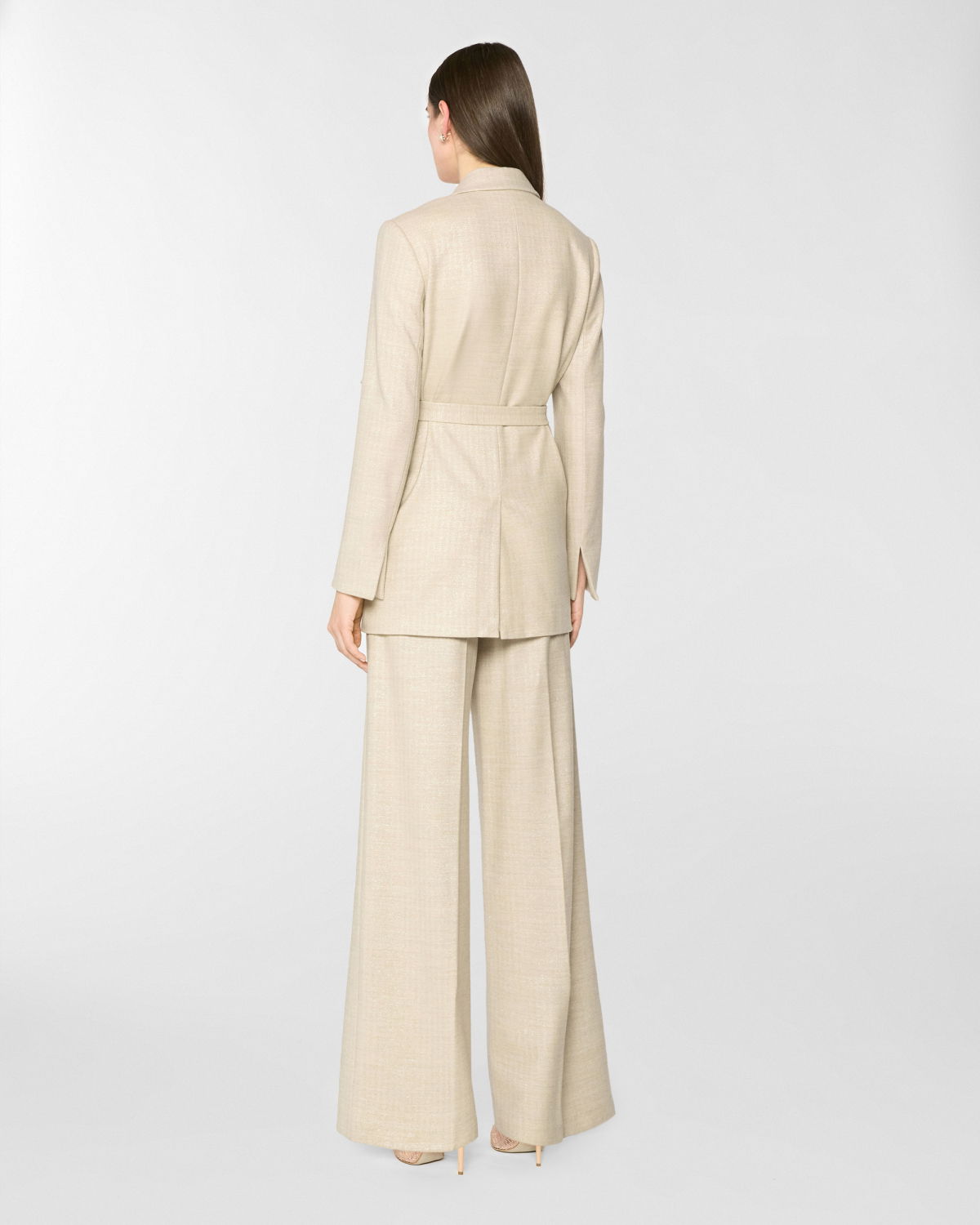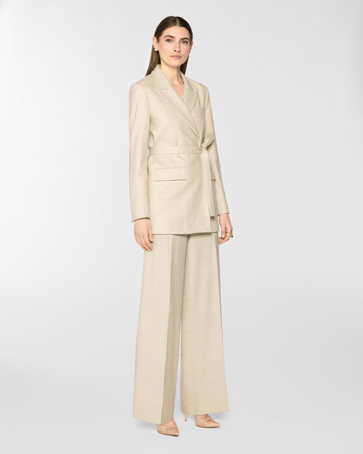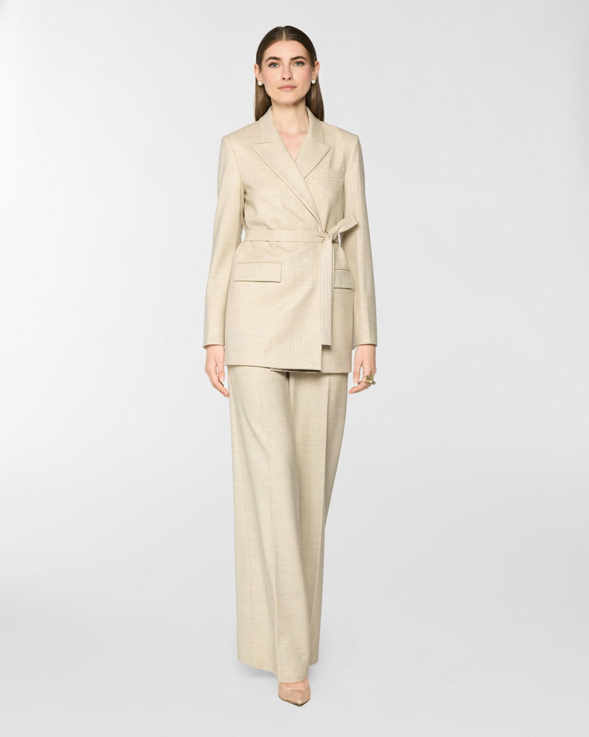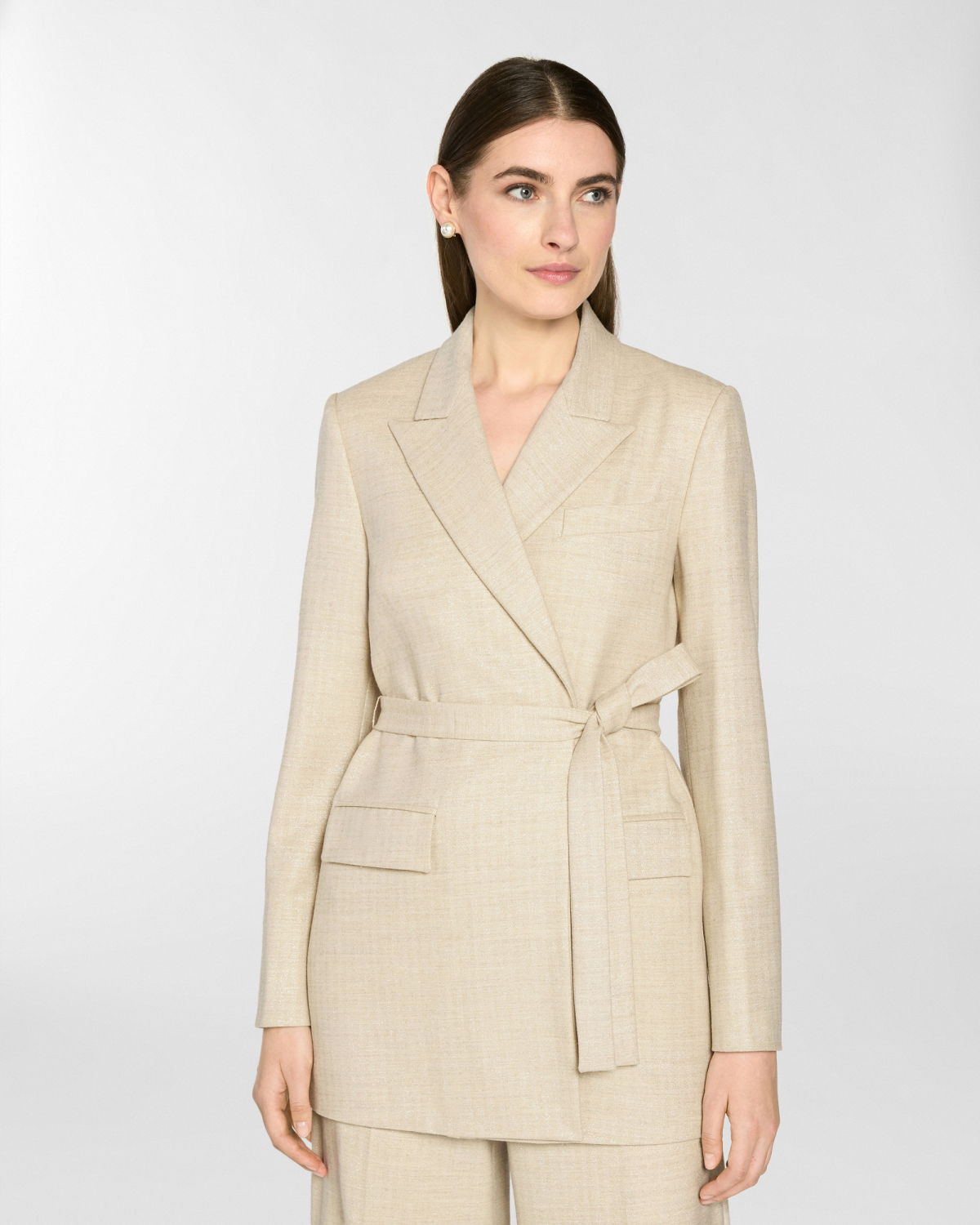 This deconstructed flannel jacket features a soft cut and a waist belt that defines the silhouette. The design is completed with peak lapels, flap pockets, and a regular fit, with a hip-length cut for versatile elegance. The fitted line gently highlights the waist.