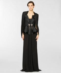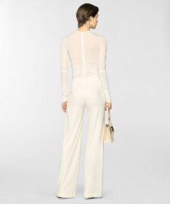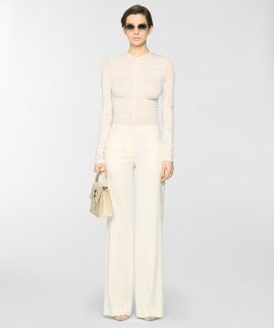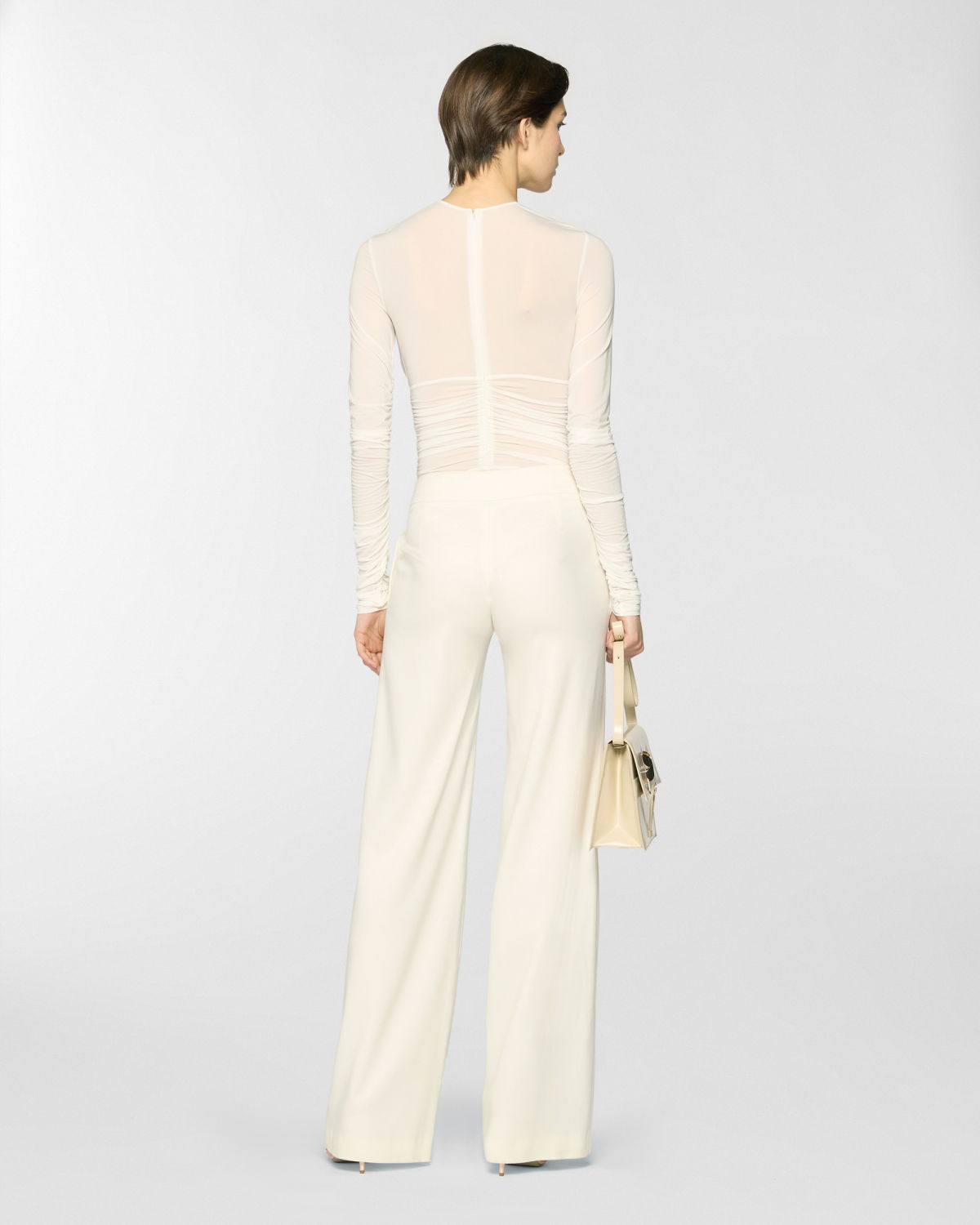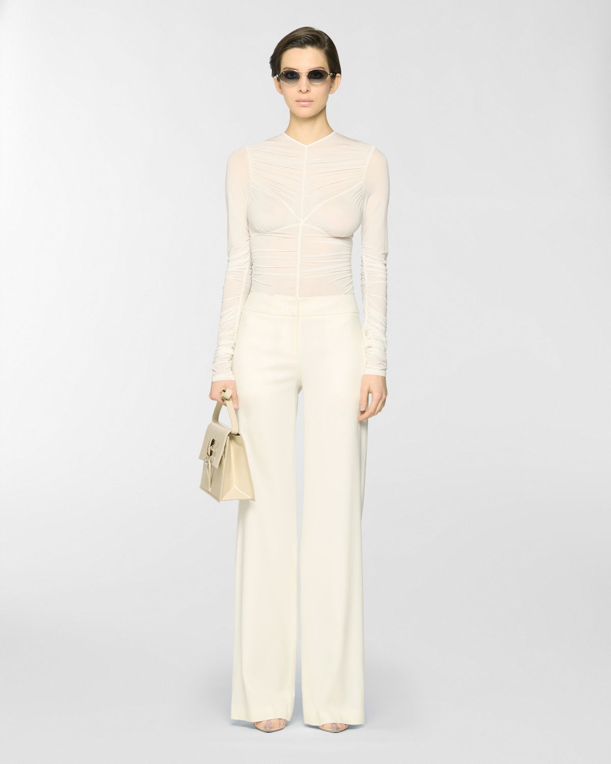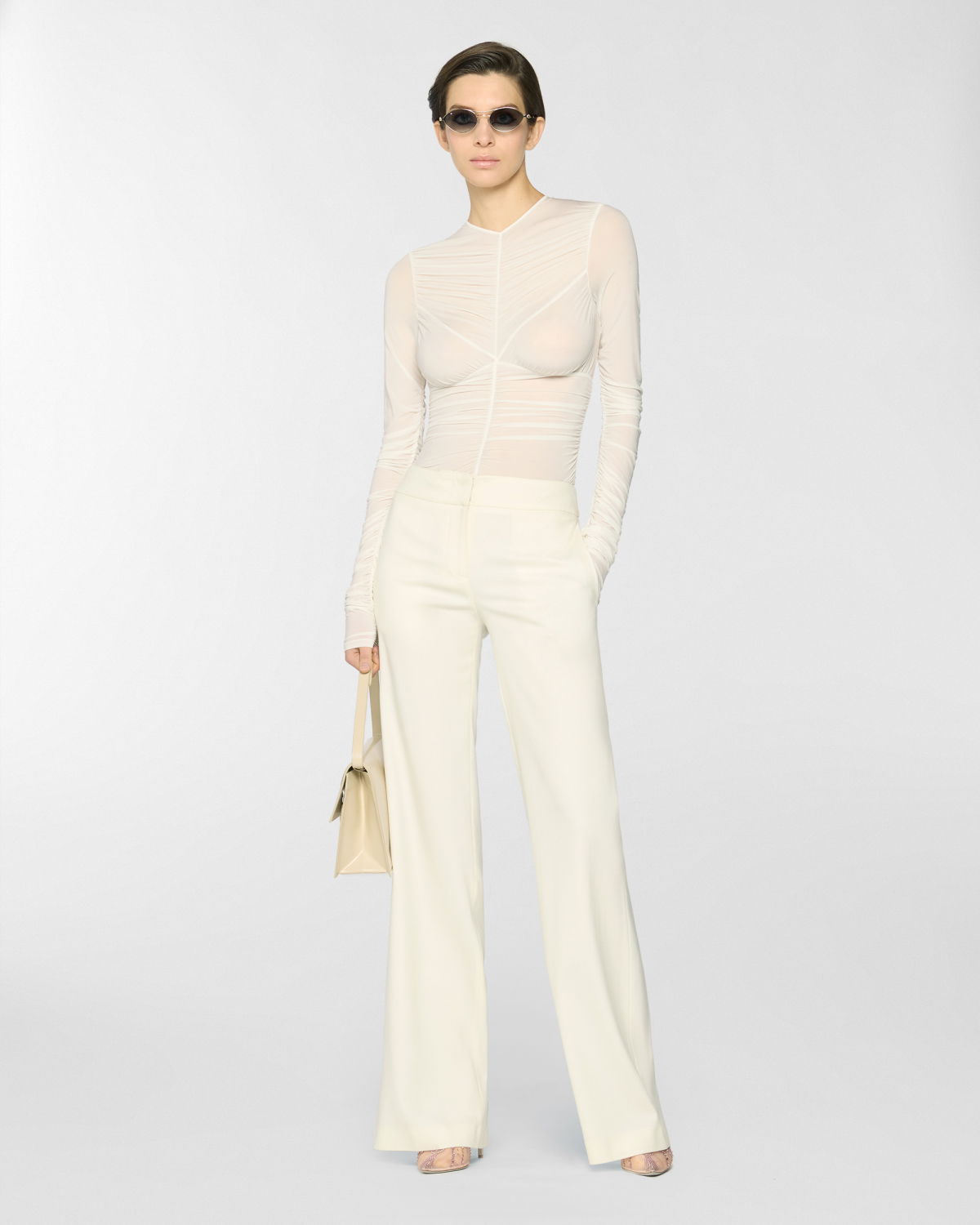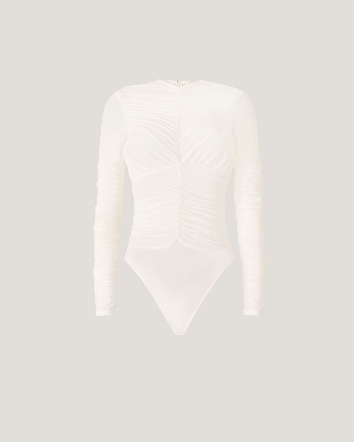 A form-fitting bodysuit enhanced by an elegant draped effect that flows across the bodice and sleeves. Crafted from jersey with a subtly sheer texture, it gently caresses the skin with lightness and grace.