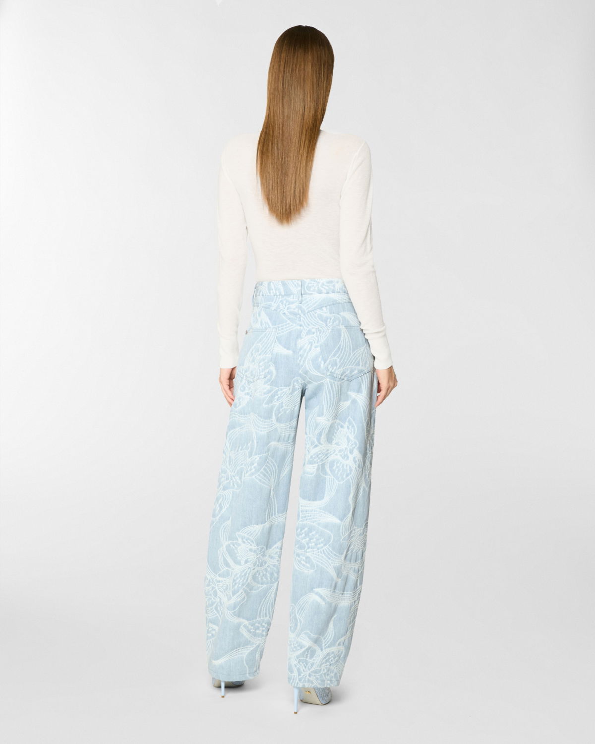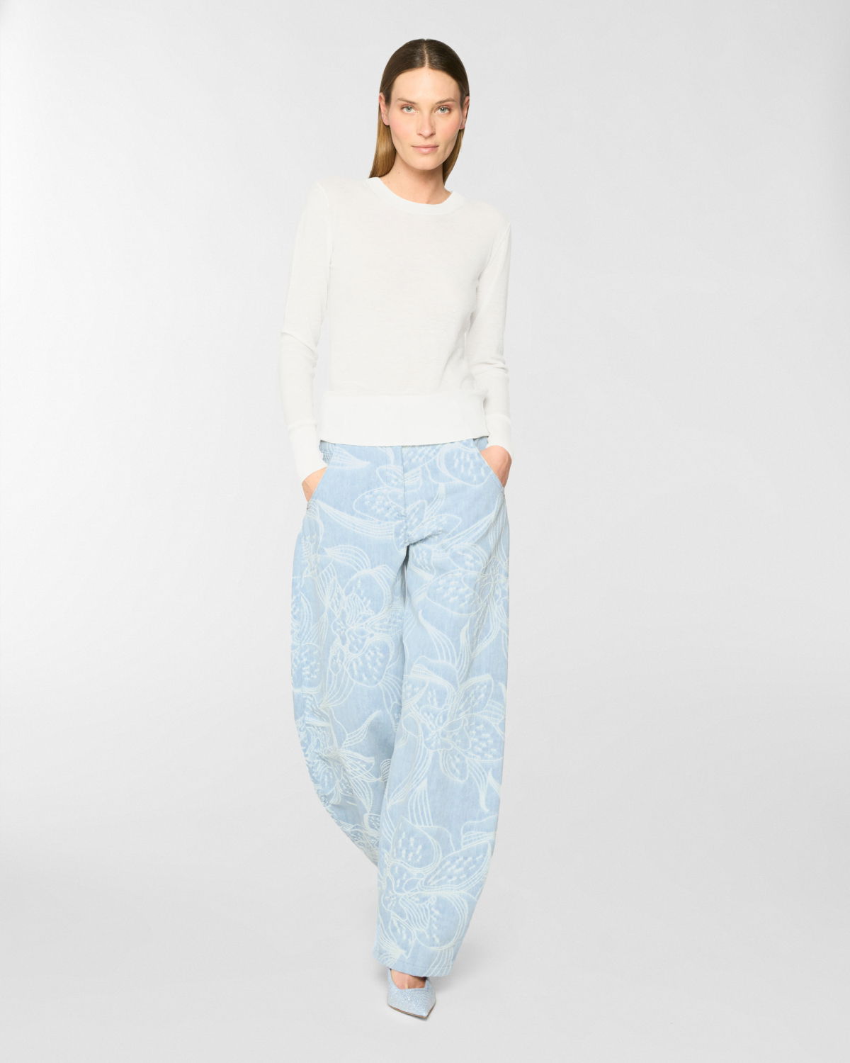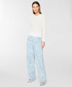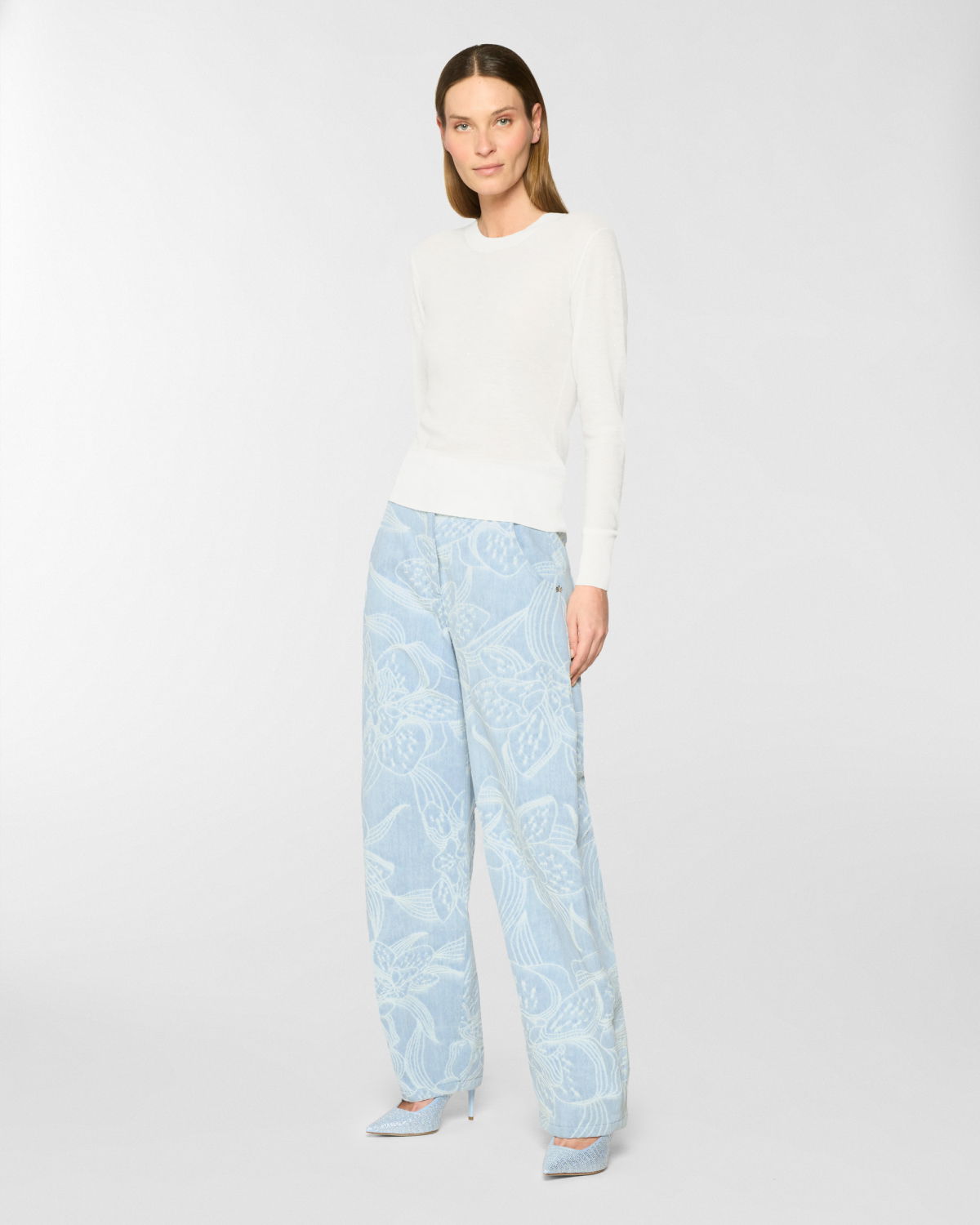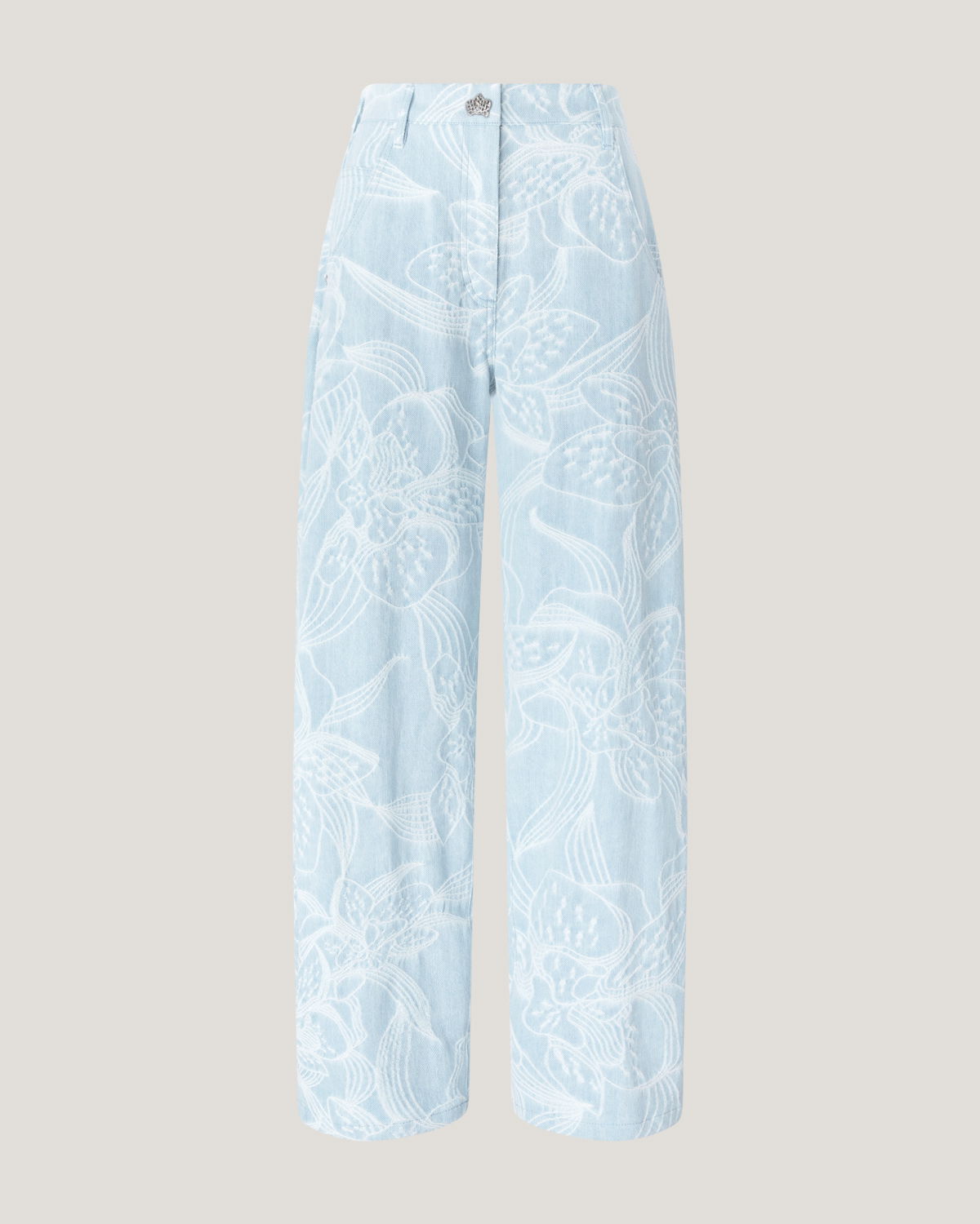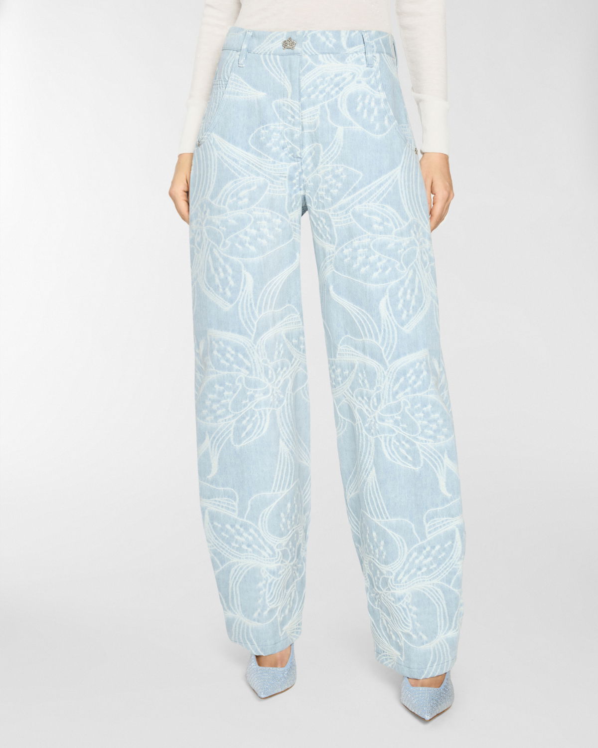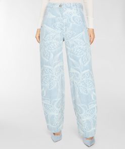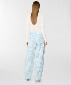 These five-pocket pants in jacquard denim with an orchid motif reinterpret casualwear with a refined touch. The relaxed fit tapers gently at the hem, shaping a modern, feminine silhouette. Designed with a mid-rise waist and ankle length, this piece is both versatile and detail-focused. The closure features a concealed snap button with a twisted plaque, evoking the Maison iconic orchid and adorned with a delicate mini pearl.