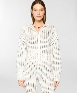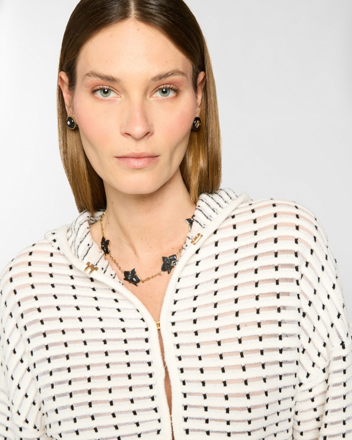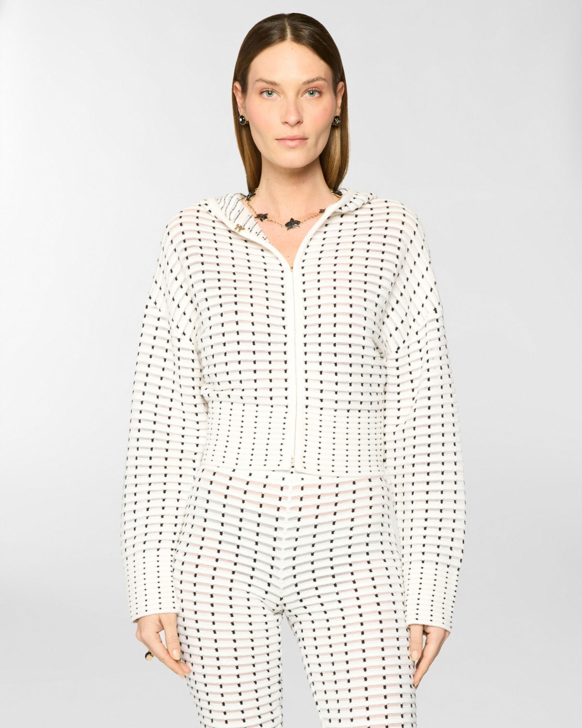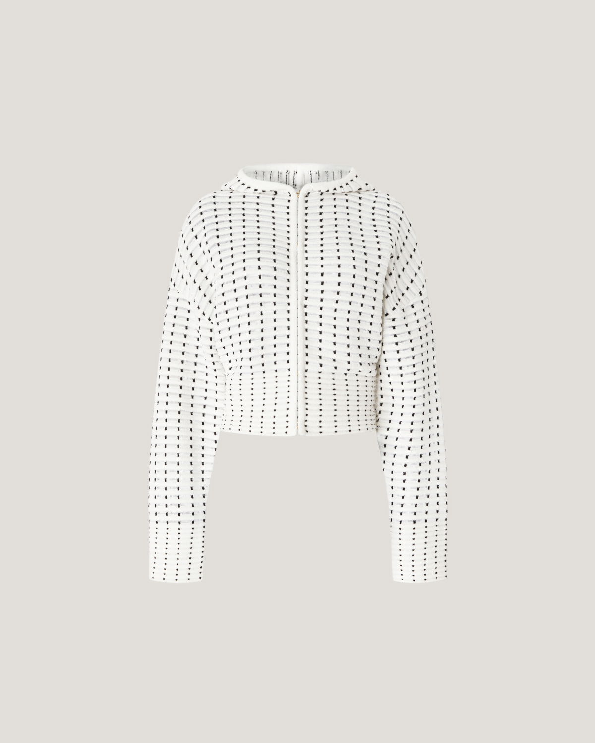 Crafted in knit with the brand iconic pattern, this bomber features a generous hood and a kiss-front closure with hidden hooks. The relaxed cut is balanced by a defined waist that enhances the silhouette. A comfortable yet refined piece, perfect for elevating even the most casual looks.