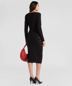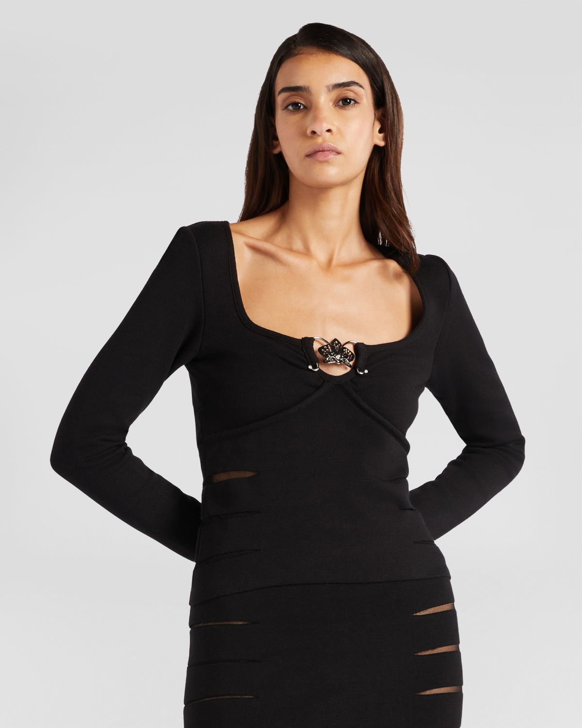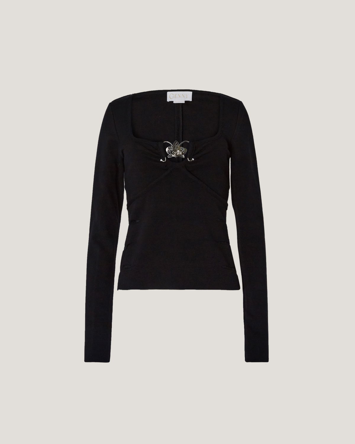 This exquisite piece is adorned with an orchid buckle at the center front. The finely crafted knit fabric provides a flattering fit, seamlessly combining comfort and sophistication.