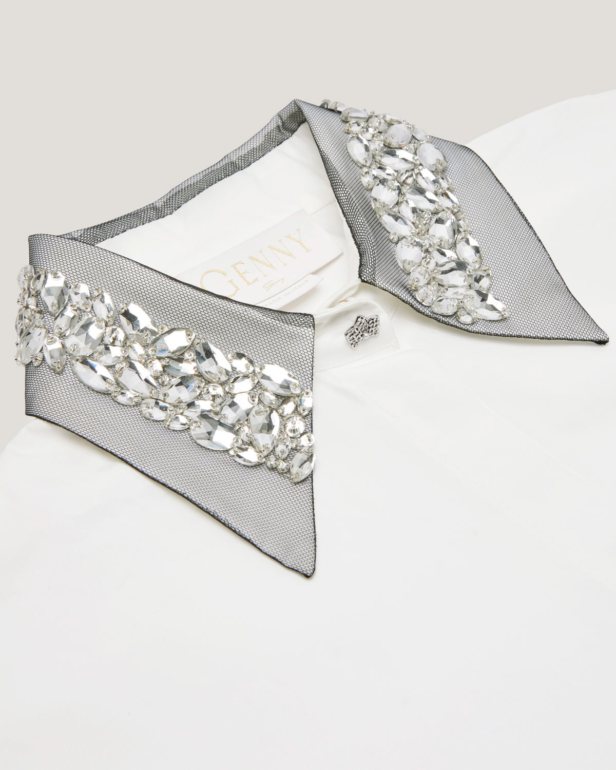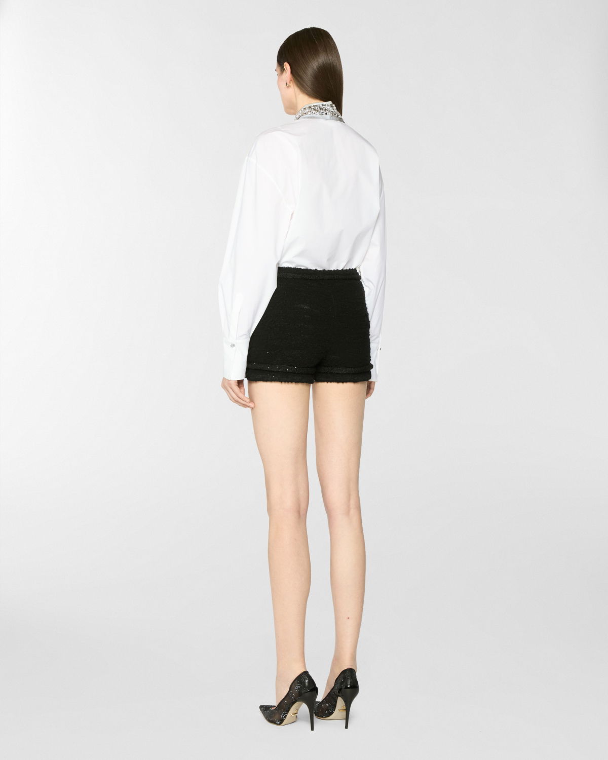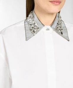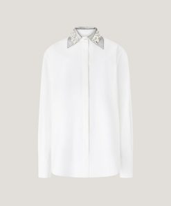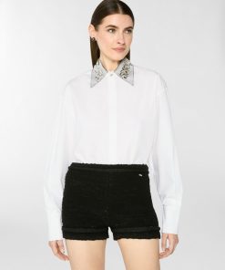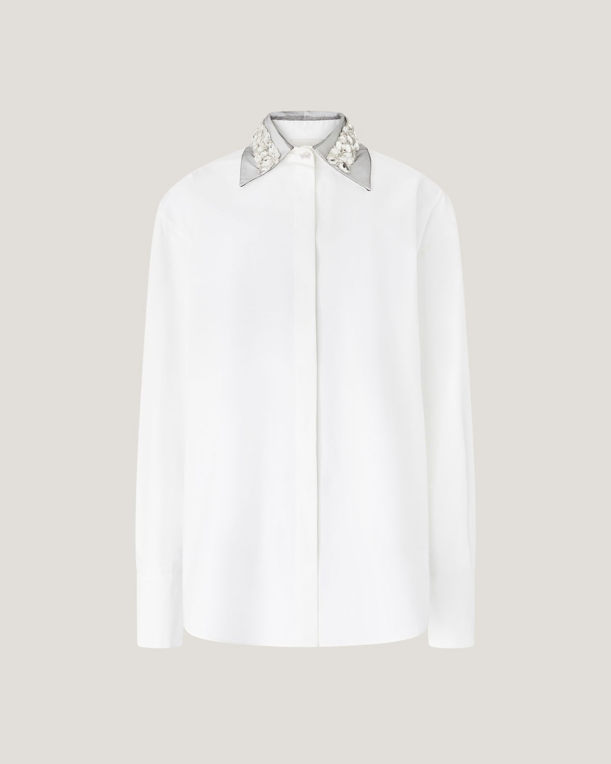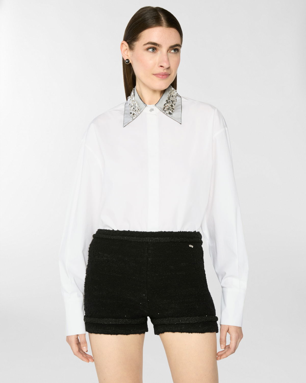The clean design of this oversized shirt in stretch cotton poplin is elevated by refined details: long sleeves, a rounded hem, and a classic collar embellished with sparkling rhinestones. A twisted plaque, symbolizing the Maison iconic orchid and adorned with a delicate mini pearl, softly enhances both the collar and cuffs, adding a subtle touch of light and femininity to the essential silhouette. The concealed front button placket underscores the purity of the lines, while side slits add graceful movement.