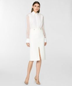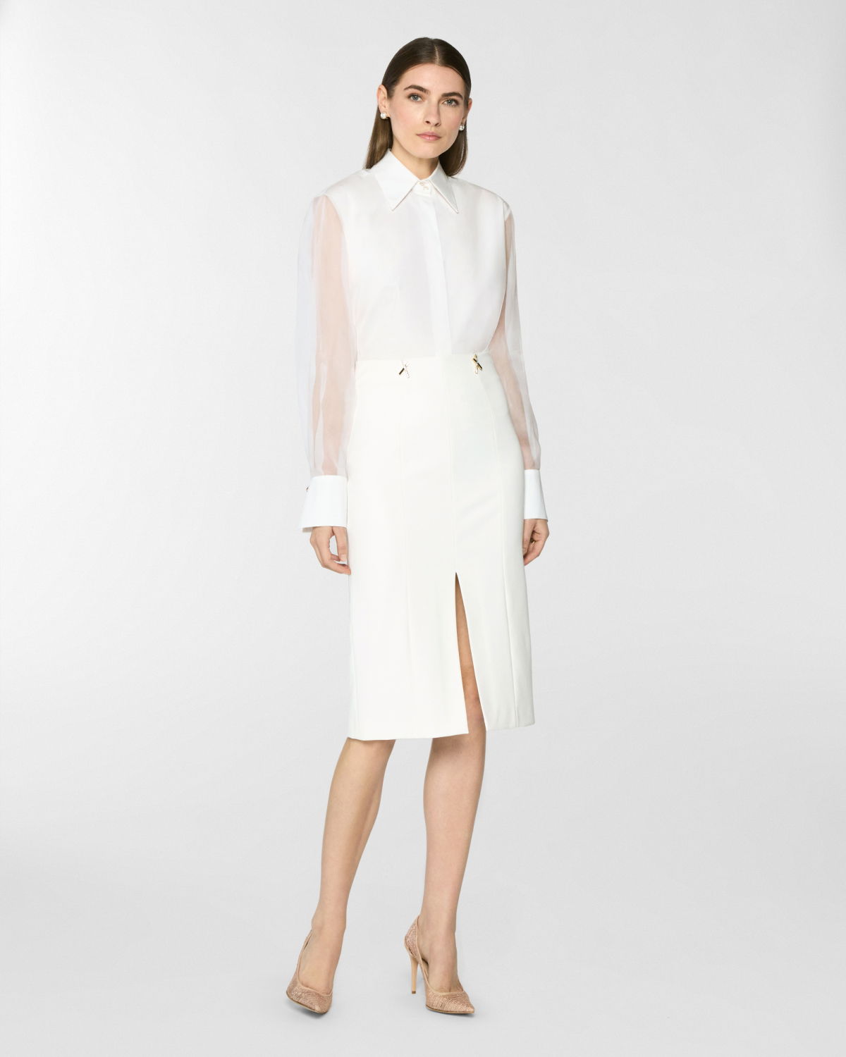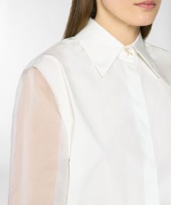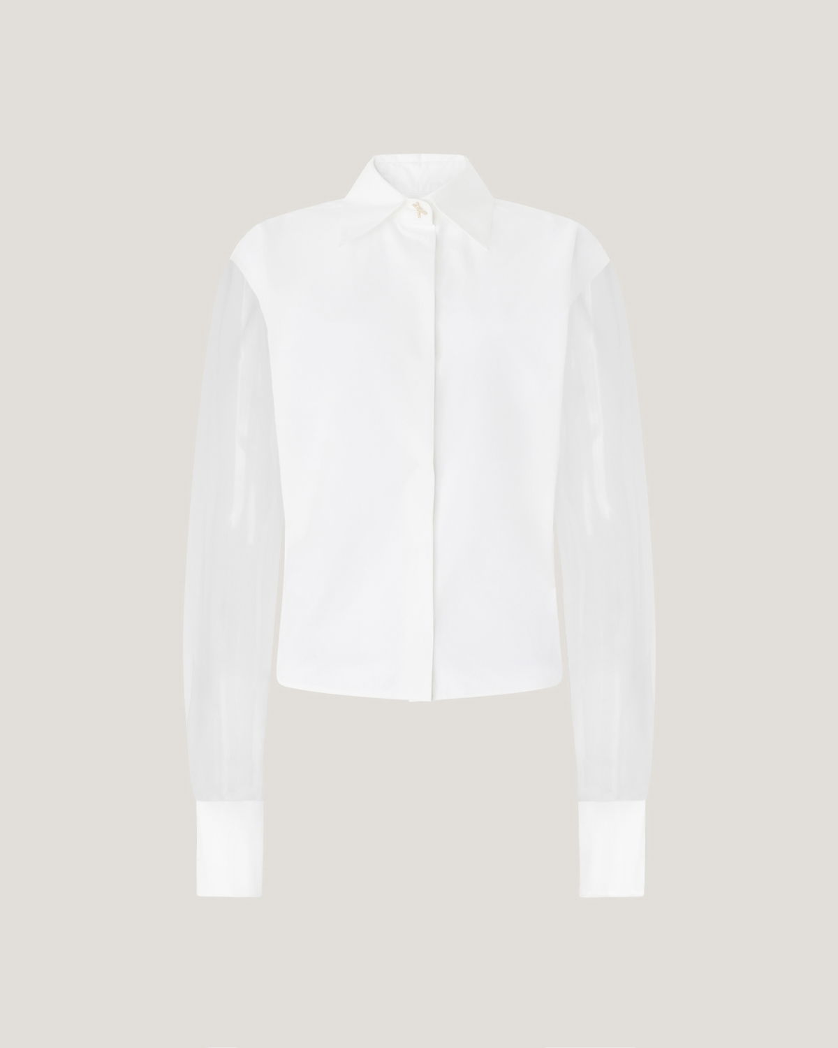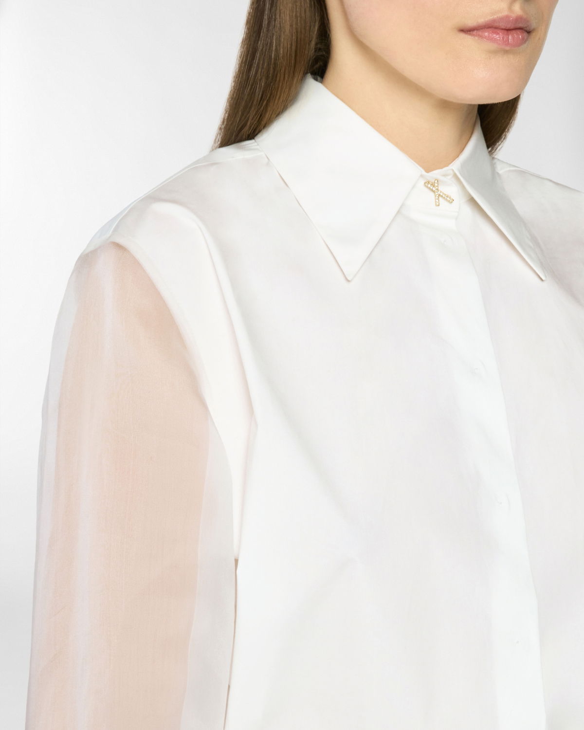 This feminine-cut shirt is crafted from cotton poplin and features long, sheer organza sleeves. The bodice fits close to the body, while the sleeves remain soft and voluminous. A signature “X”-shaped plaque delicately accents the collar and cuffs, adding a subtle touch of light and femininity to the clean design. The waist is gently defined, and the hemline is straight.