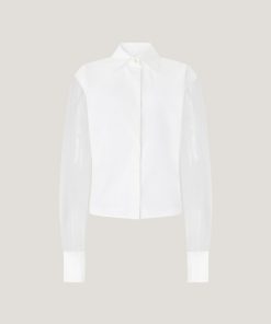 This feminine-cut shirt is crafted from cotton poplin and features long, sheer organza sleeves. The bodice fits close to the body, while the sleeves remain soft and voluminous. A signature “X”-shaped plaque delicately accents the collar and cuffs, adding a subtle touch of light and femininity to the clean design. The waist is gently defined, and the hemline is straight.