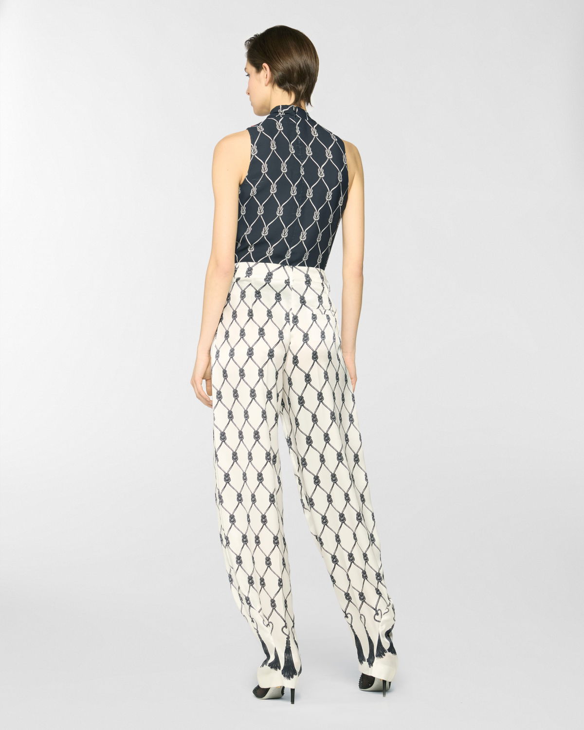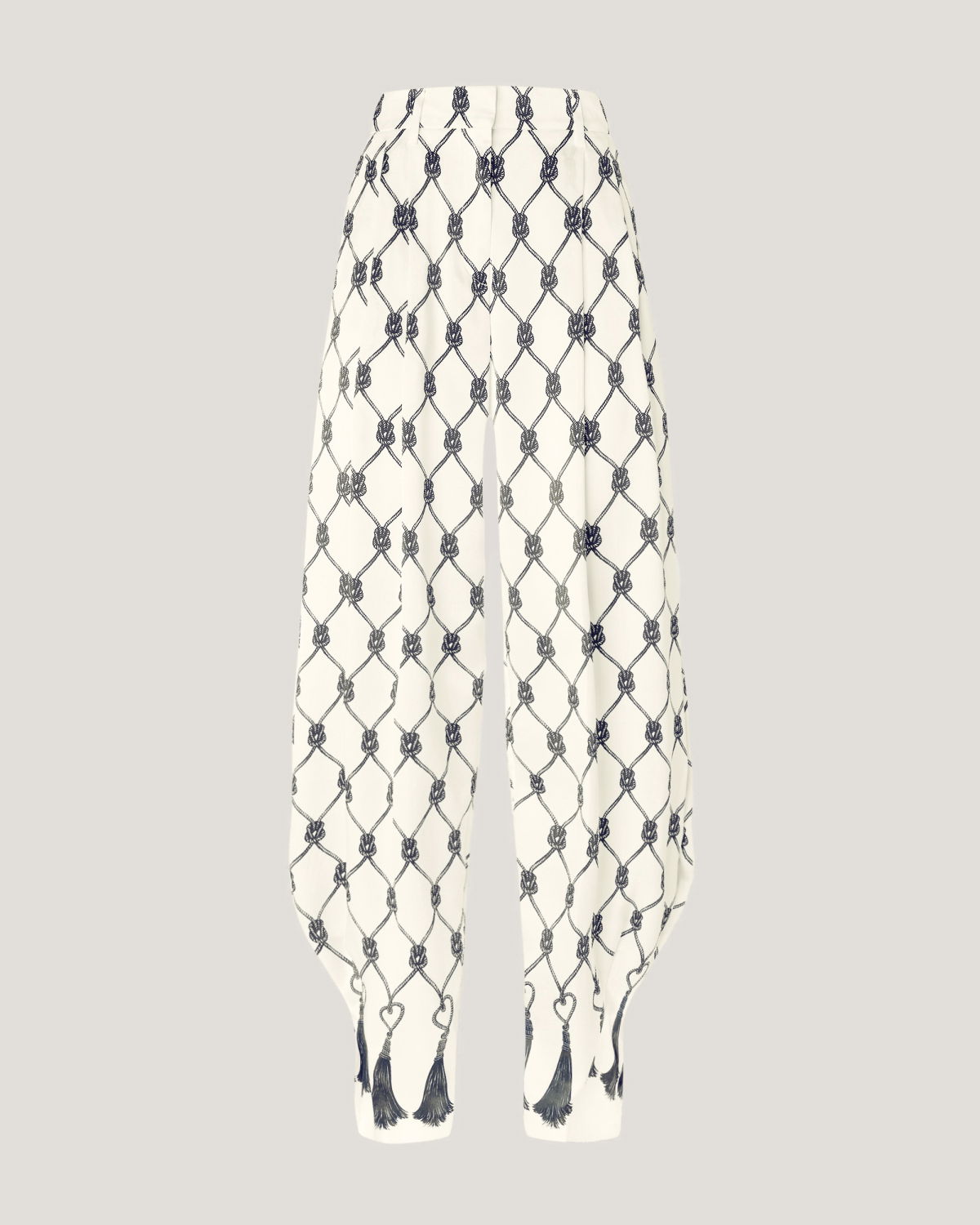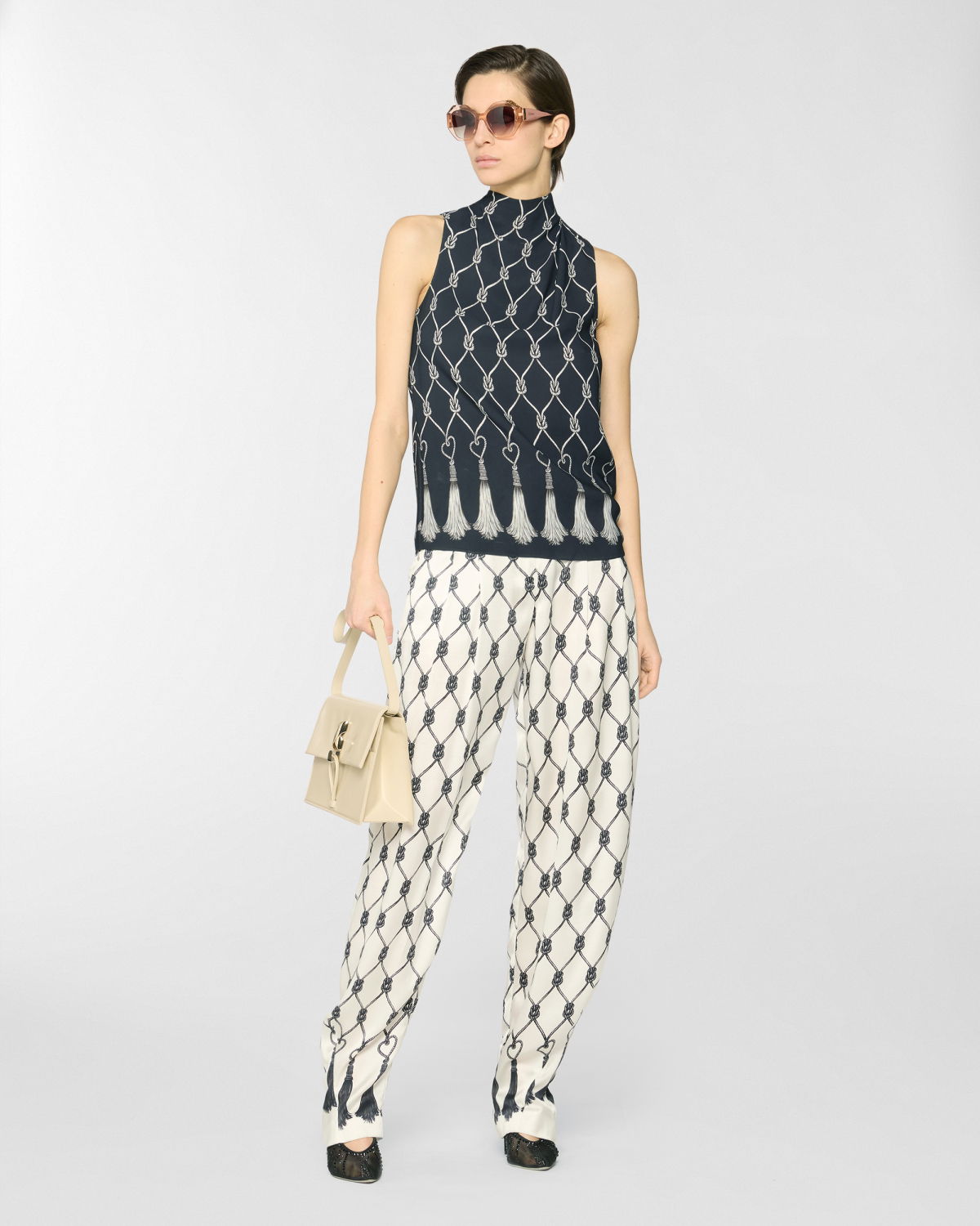 Crafted from pure silk, these long pants feature a fluid, soft silhouette enhanced by front pleats that add volume and graceful movement. The intricate graphic motif evokes an elegant ornamental mesh, finished with tassels—an element that recalls the vintage spirit of Maison Genny. High-waisted with a structured waistband, French pockets at the sides, and a single welt pocket at the back.