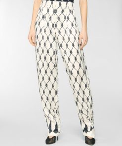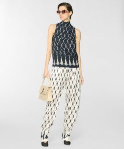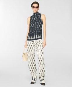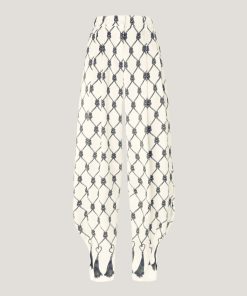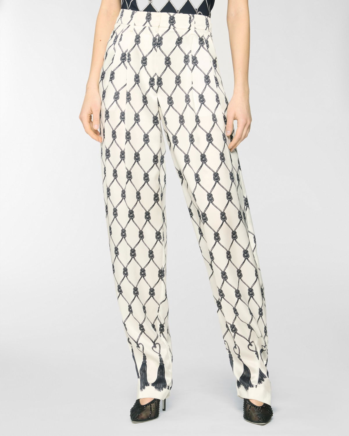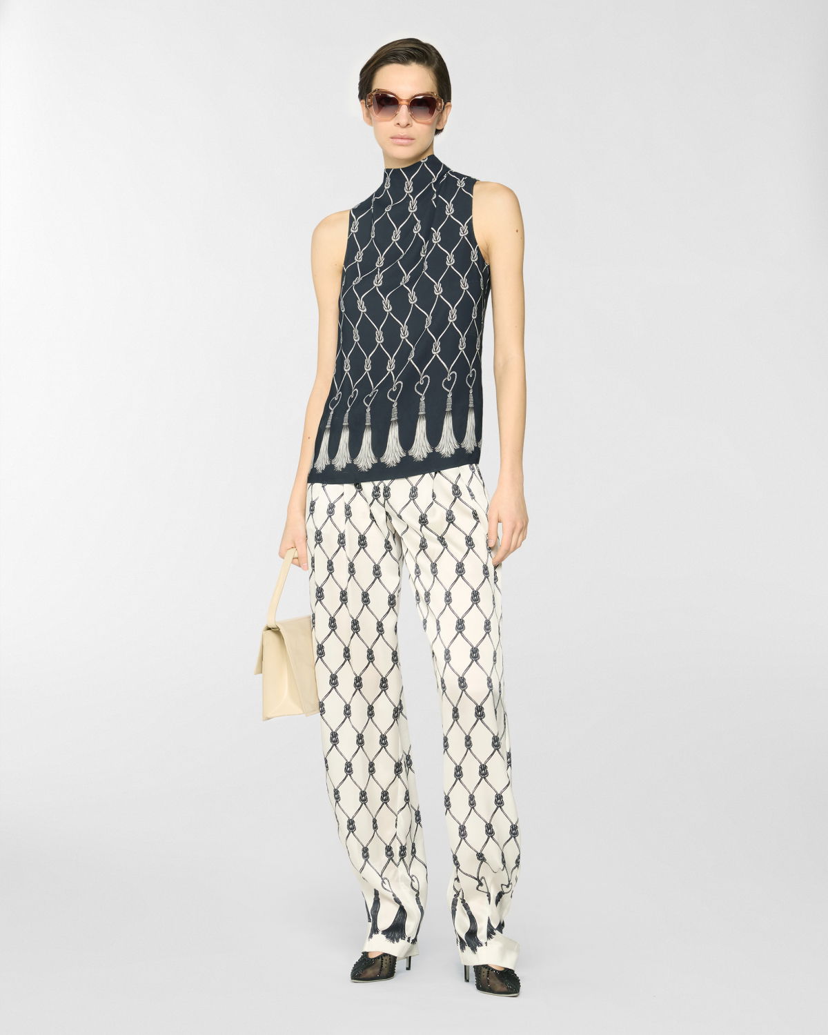 Crafted from pure silk, these long pants feature a fluid, soft silhouette enhanced by front pleats that add volume and graceful movement. The intricate graphic motif evokes an elegant ornamental mesh, finished with tassels—an element that recalls the vintage spirit of Maison Genny. High-waisted with a structured waistband, French pockets at the sides, and a single welt pocket at the back.