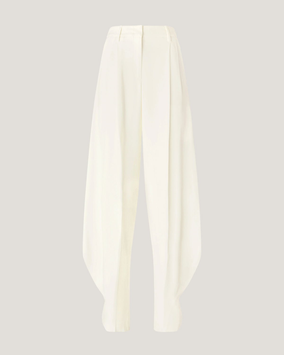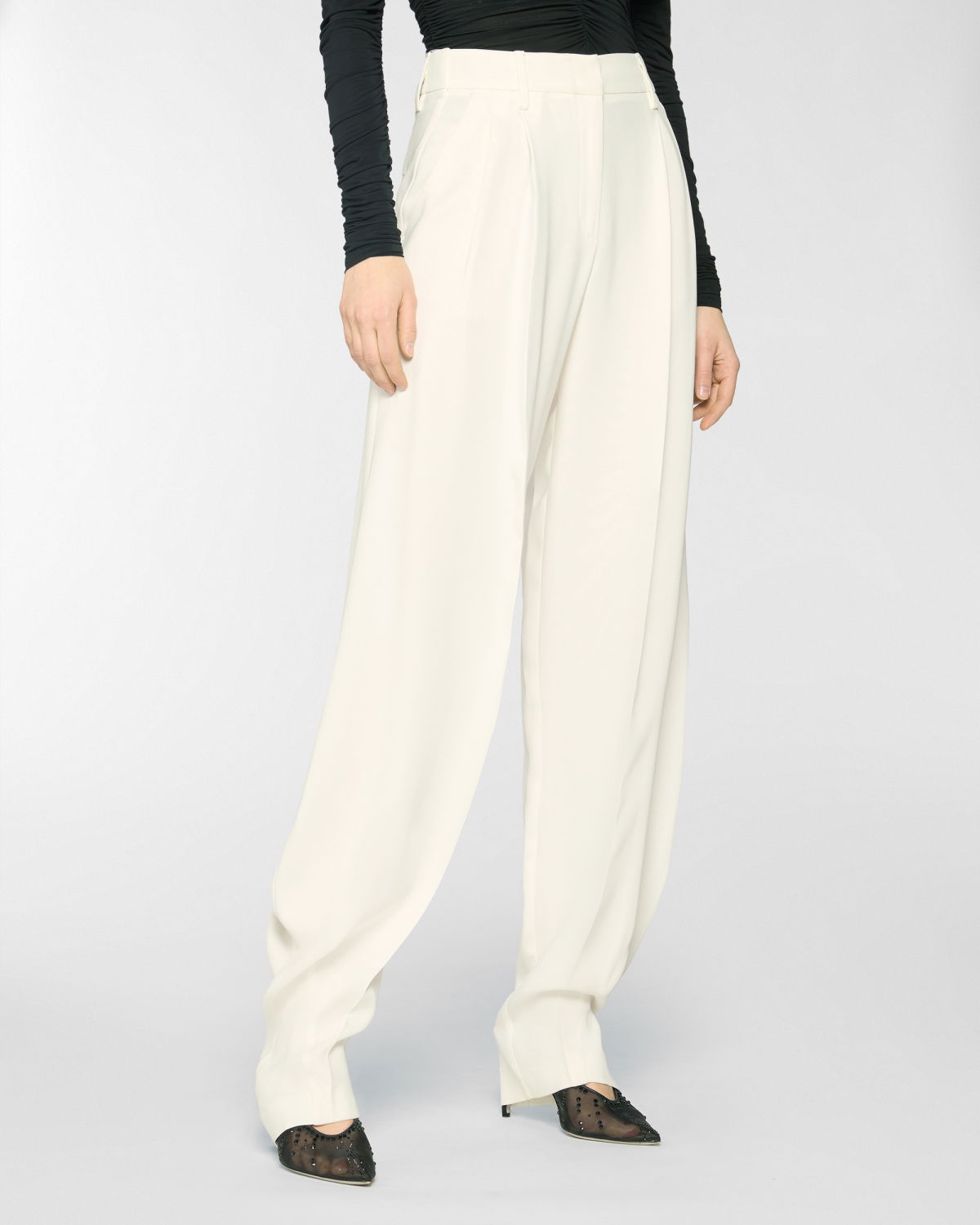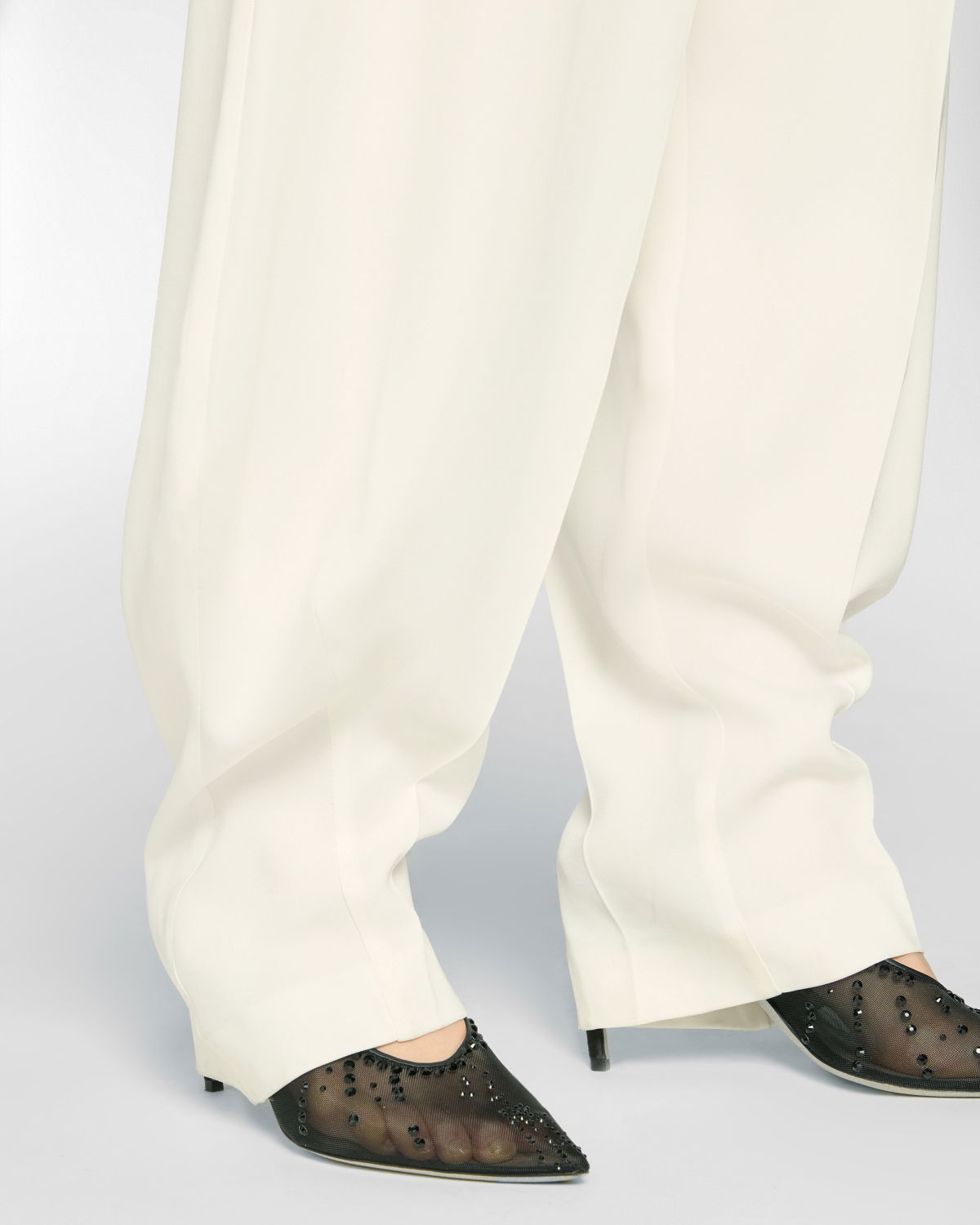 Long pants with a fluid, soft silhouette, enhanced by front pleats that add volume and graceful movement. High-waisted with a structured waistband, French pockets at the sides, and a single welt pocket at the back. Crafted from a viscose-blend cady with a subtly lustrous texture.