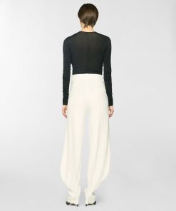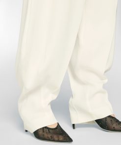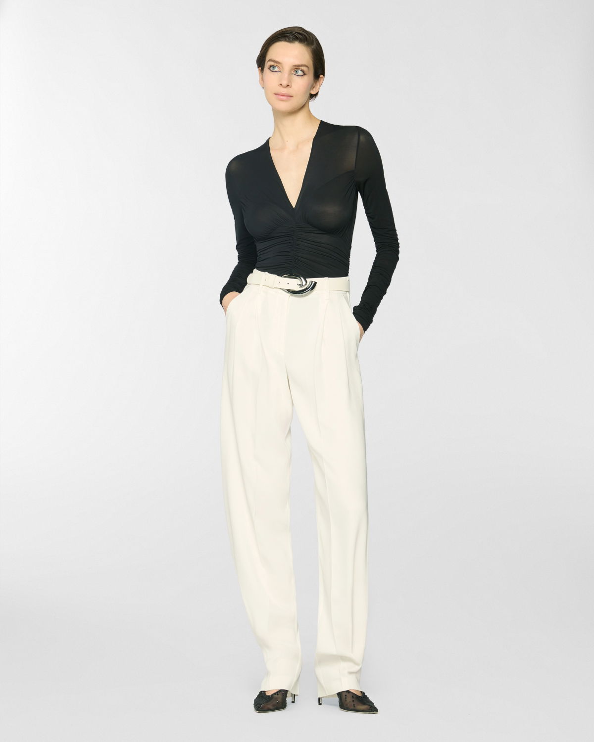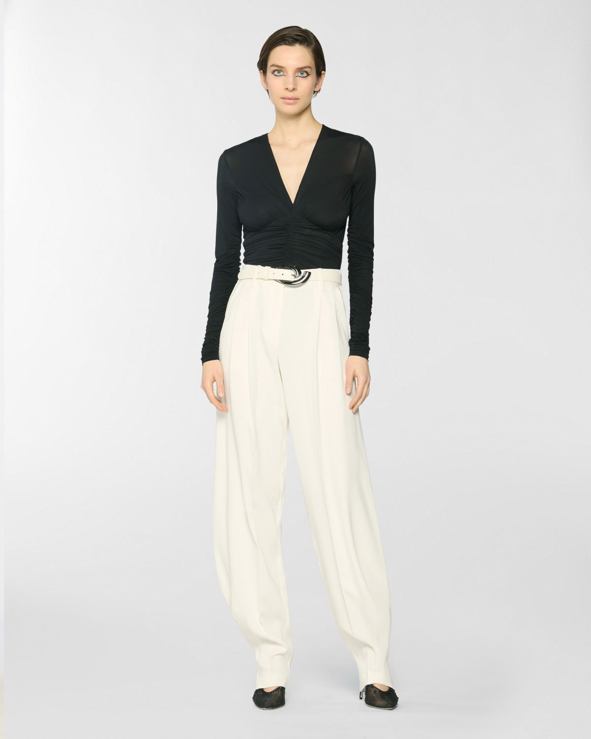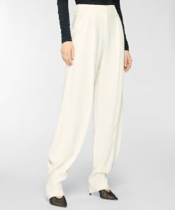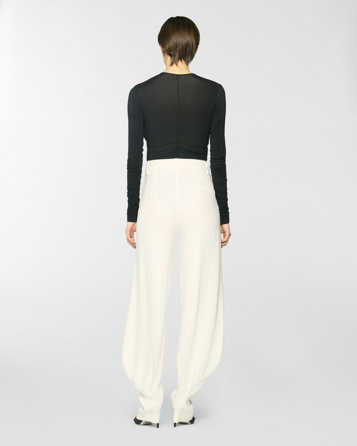 Long pants with a fluid, soft silhouette, enhanced by front pleats that add volume and graceful movement. High-waisted with a structured waistband, French pockets at the sides, and a single welt pocket at the back. Crafted from a viscose-blend cady with a subtly lustrous texture.