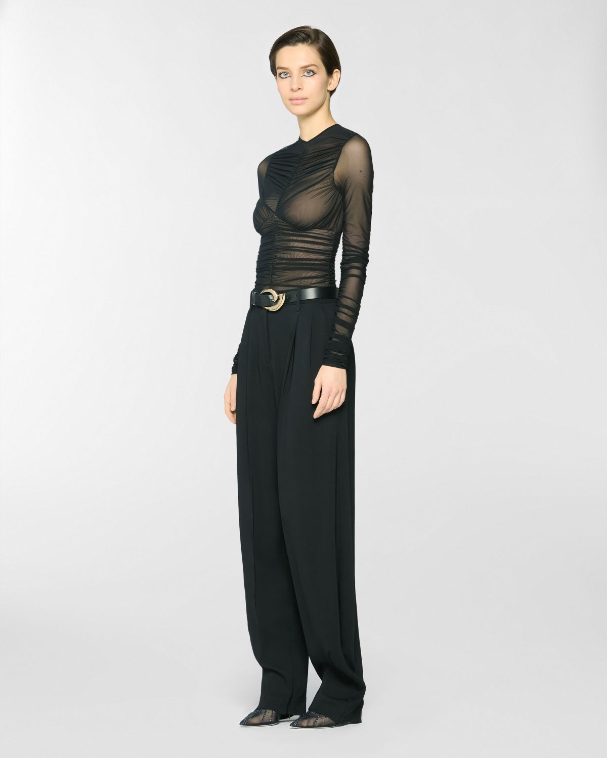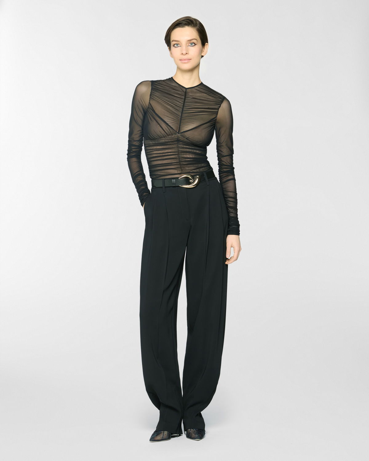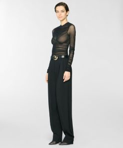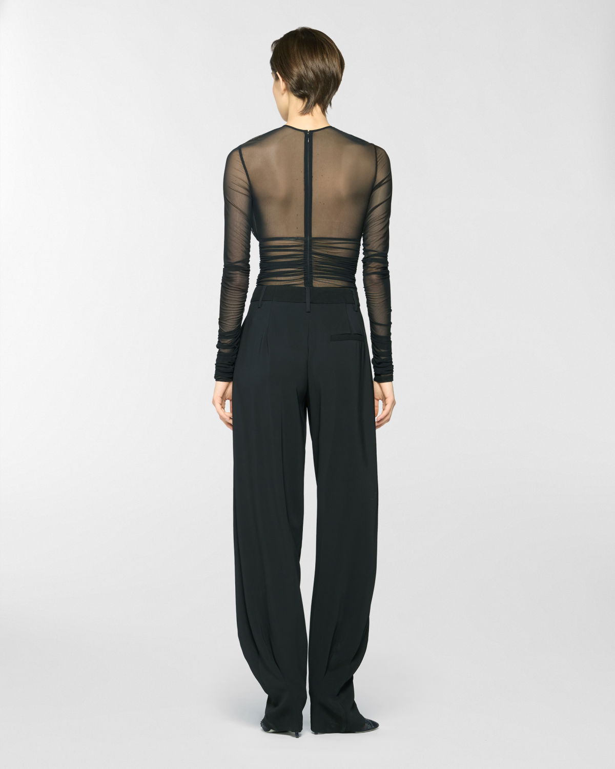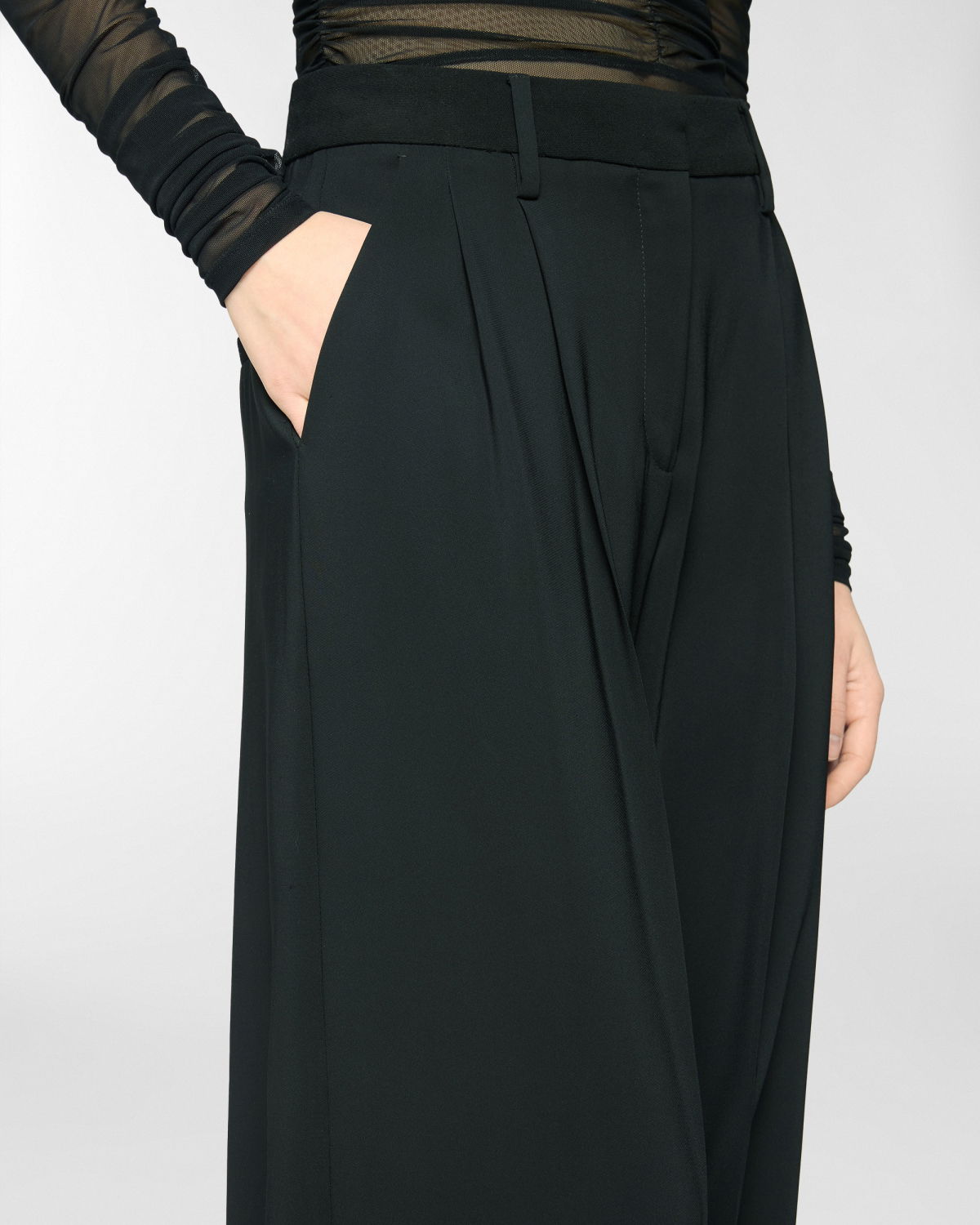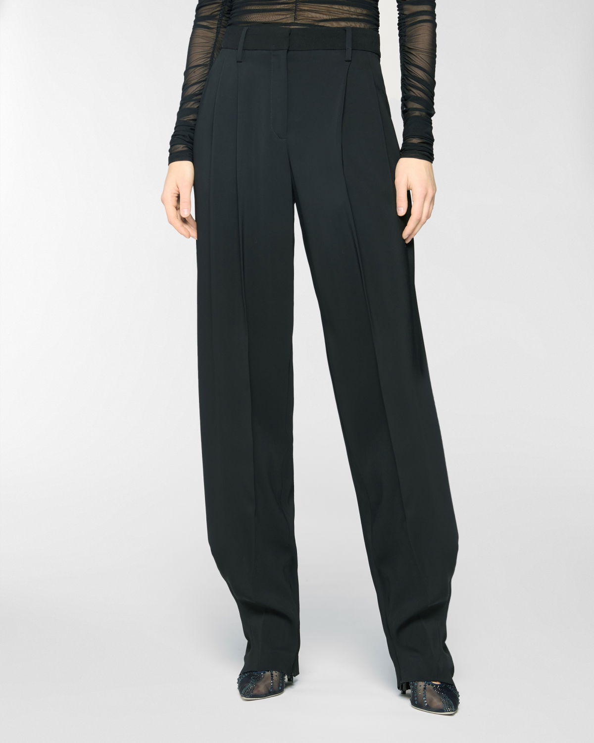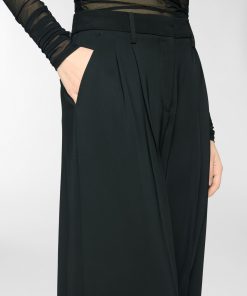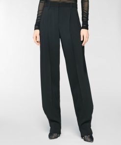 Long pants with a fluid, soft silhouette, enhanced by front pleats that add volume and graceful movement. High-waisted with a structured waistband, French pockets at the sides, and a single welt pocket at the back. Crafted from a viscose-blend cady with a subtly lustrous texture.