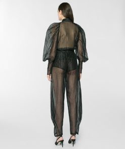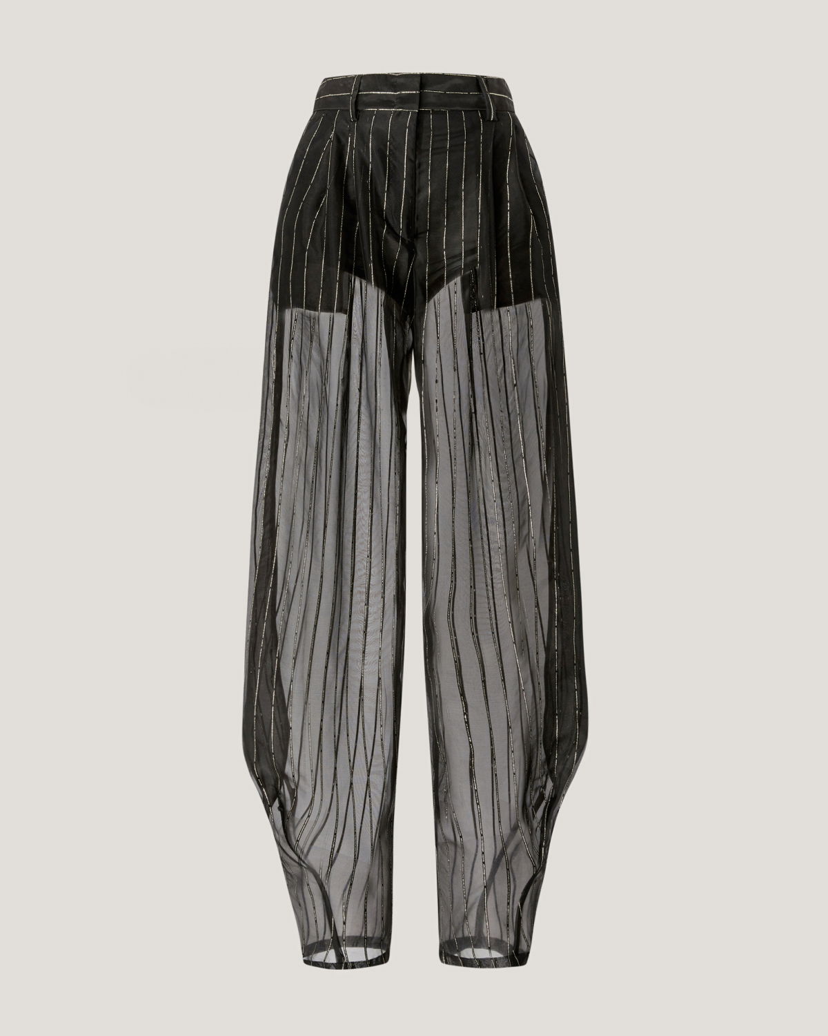 Long pants with a fluid, soft silhouette, featuring a high waist with waistband and front pleats that add volume and graceful movement. Crafted from lightweight, sheer silk organza woven with lurex threads, they offer a refined, luminous finish. An inner short ensures coverage while preserving the airy elegance of the design.
