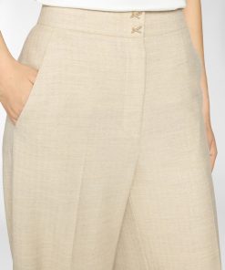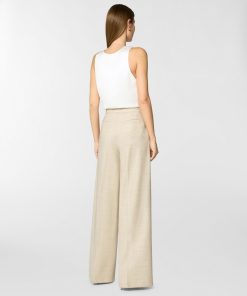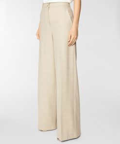 These tailored palazzo pants are crafted from flannel. Their signature features are volume and fluidity, enhanced by a pressed crease. The mid-rise waist and French pockets contribute to a silhouette that is both graceful and refined. The hidden hook-and-eye closure is finished with two iconic “X”-shaped plaques, signature accessories of the Maison.