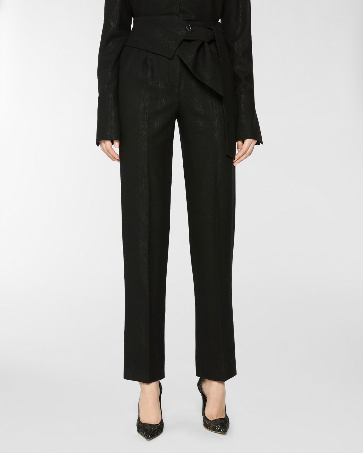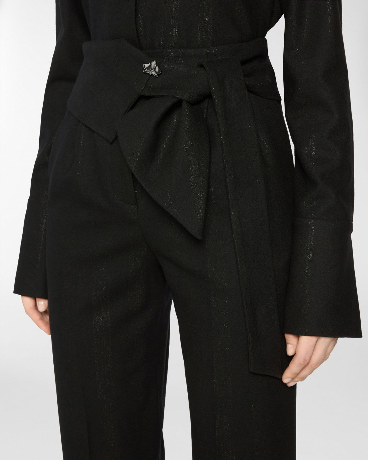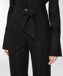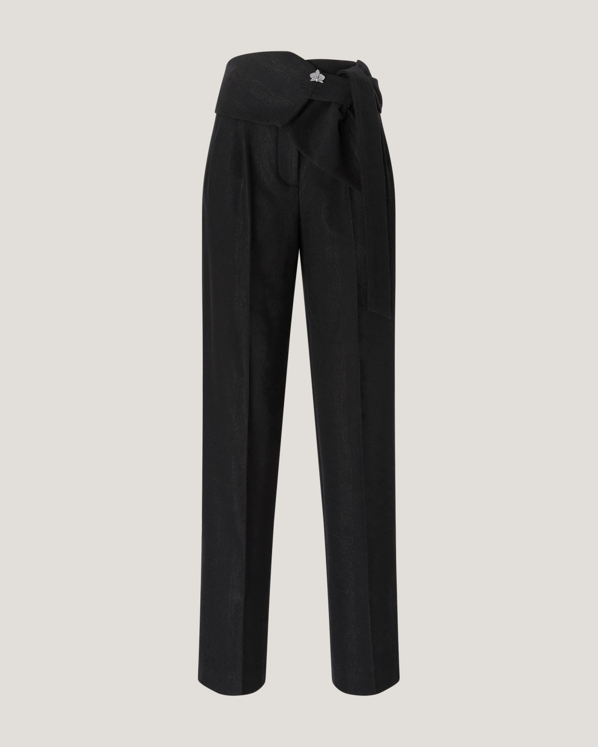 These long pants stand out for their high waistband, designed to be tied at the side with effortless grace. The straight-leg cut, defined by a pressed crease, elongates the figure and moves with poise and balance. The self-tie belt is finished with a three-dimensional plaque that evokes the Maison iconic orchid. A perfect blend of comfort and tailored elegance.