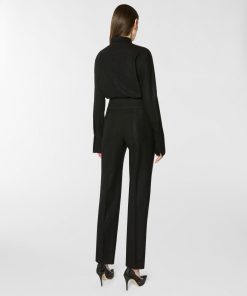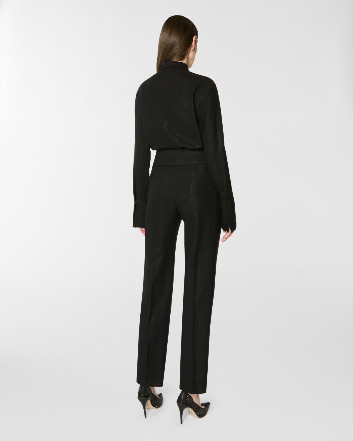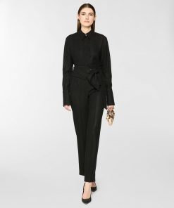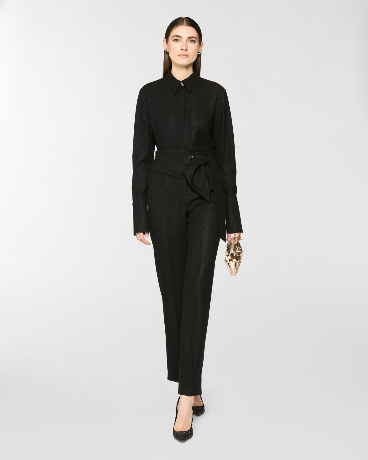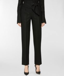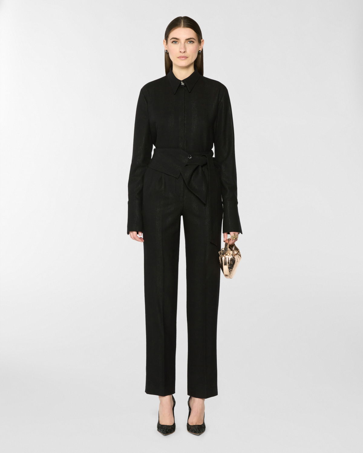 These long pants stand out for their high waistband, designed to be tied at the side with effortless grace. The straight-leg cut, defined by a pressed crease, elongates the figure and moves with poise and balance. The self-tie belt is finished with a three-dimensional plaque that evokes the Maison iconic orchid. A perfect blend of comfort and tailored elegance.