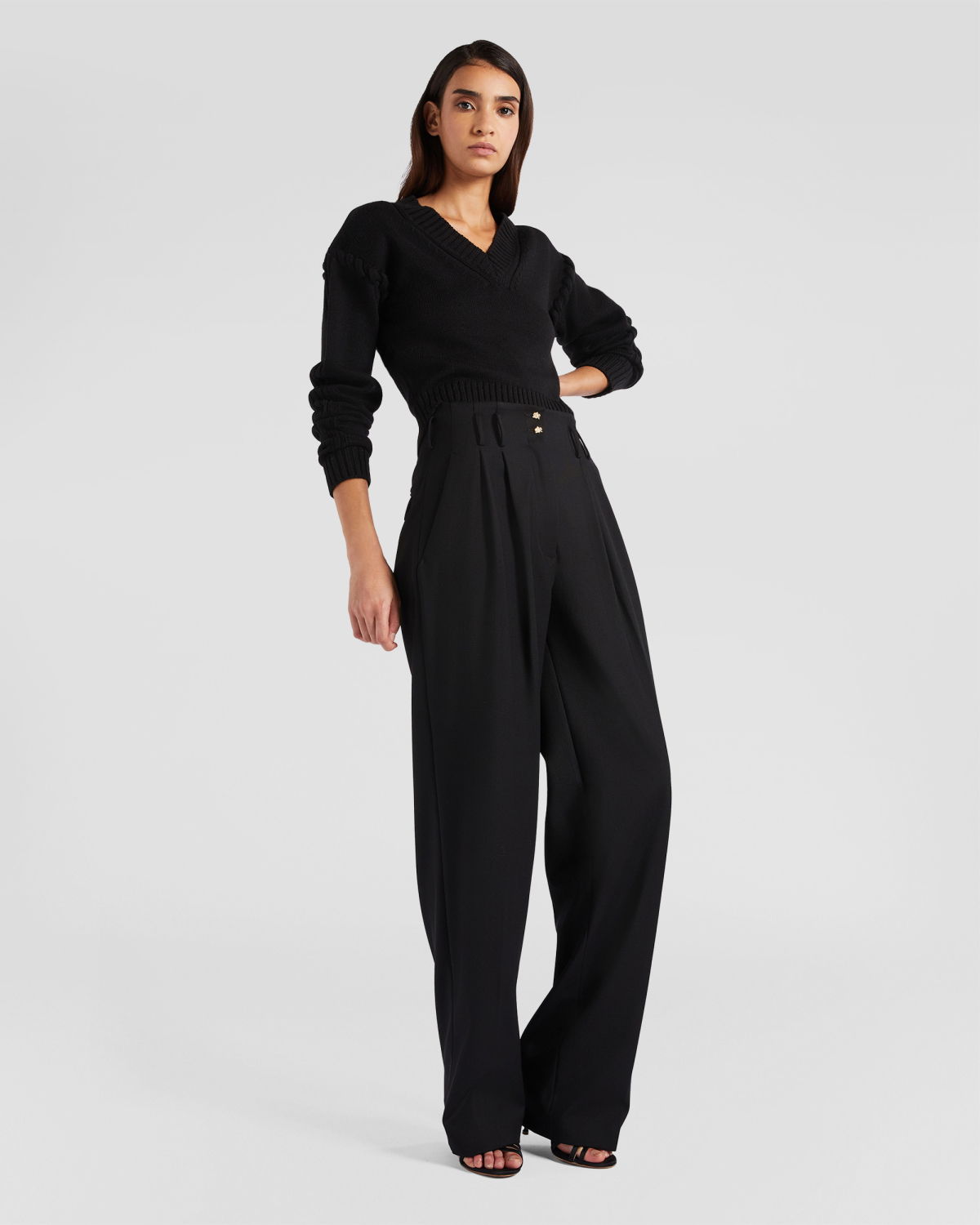 The model is 6 feet tall and wears a size 40 IT.