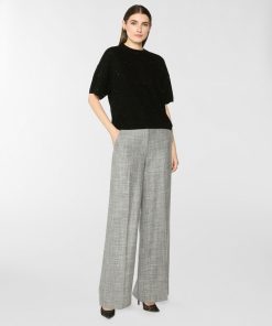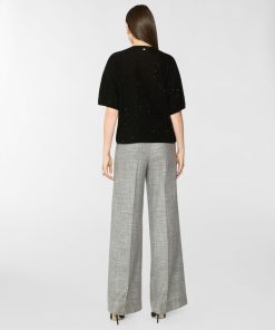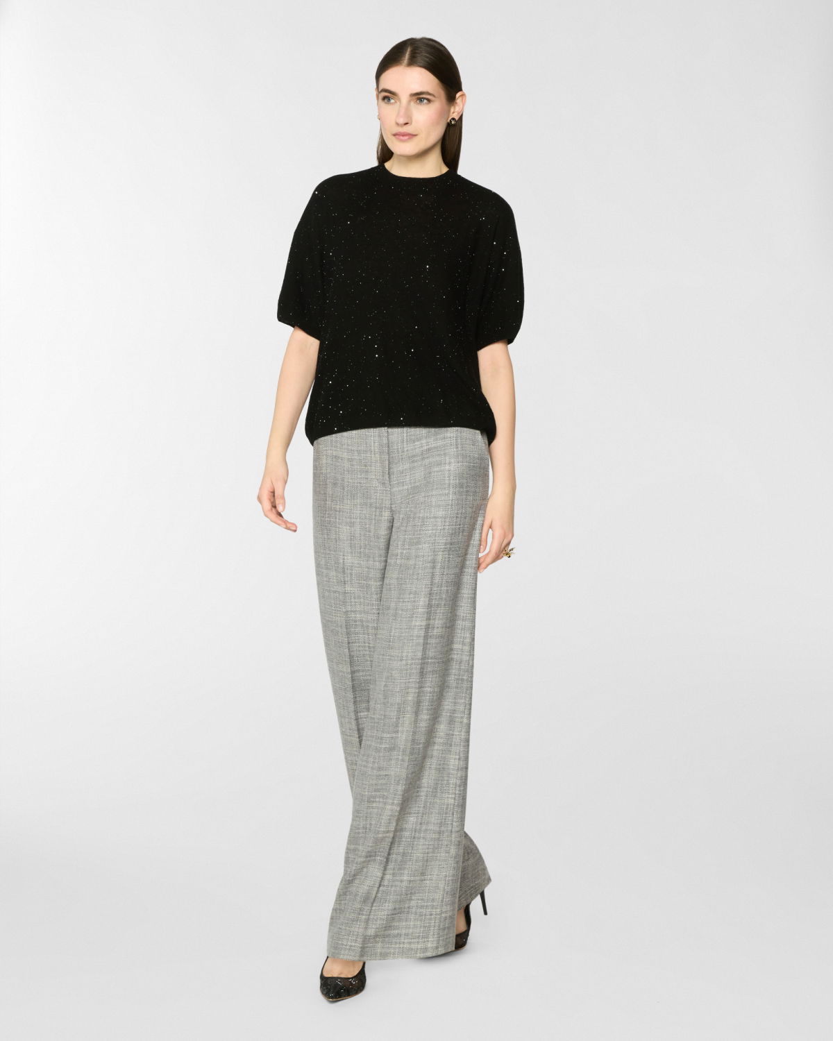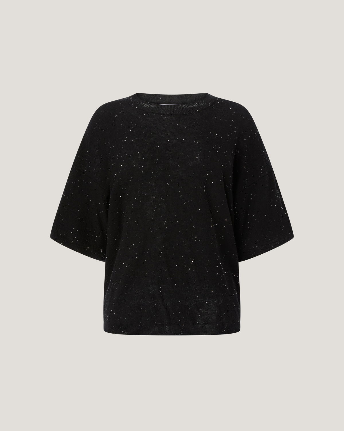 Crew-neck T-shirt in fine knit with dropped shoulders and a soft fit. The lightweight yarn embraces the silhouette with delicacy, while the micro sequins add a luminous and refined touch. The back neckline is enriched with an interlaced plaque featuring the Maison’s iconic orchid, adorned with a mini pearl.