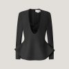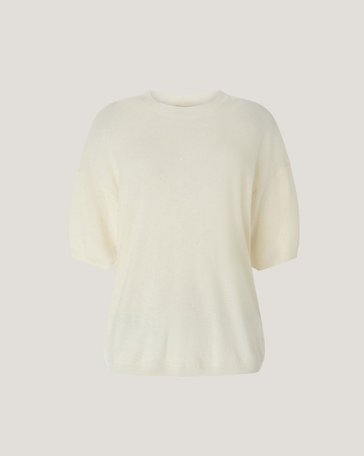 Crew-neck T-shirt in fine knit with dropped shoulders and a soft fit. The lightweight yarn embraces the silhouette with delicacy, while the micro sequins add a luminous and refined touch. The back neckline is enriched with an interlaced plaque featuring the Maison’s iconic orchid, adorned with a mini pearl.