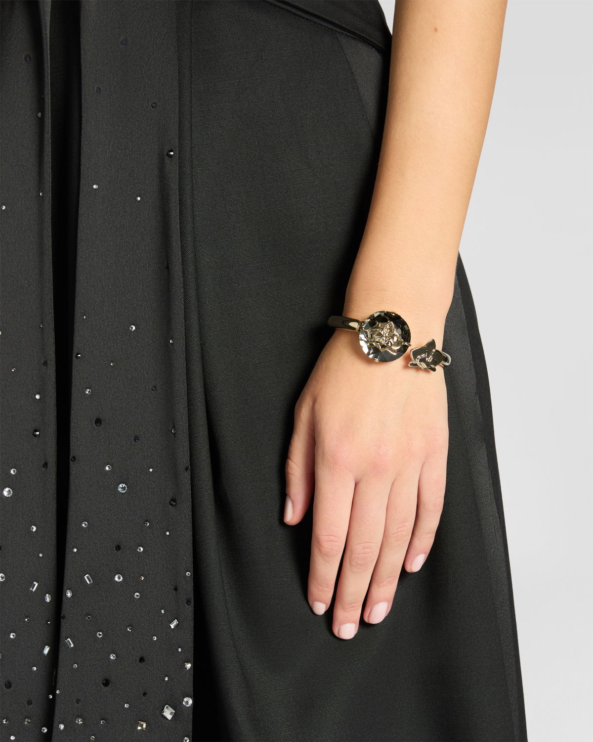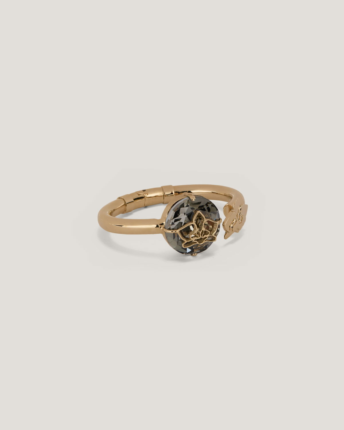 A piece that captivates at first glance. This gold-toned brass bracelet embodies timeless elegance with its dark crystal, reflecting light with mesmerizing depth. The delicately sculpted orchid decoration adds a touch of refined femininity, making it the perfect accessory to complete any look with style and exclusivity.