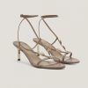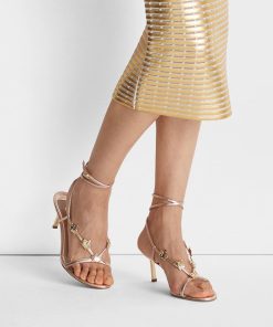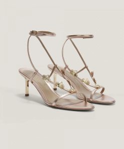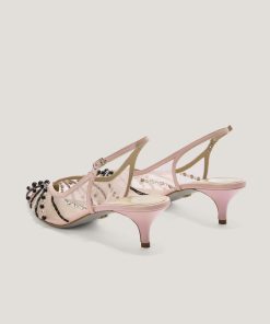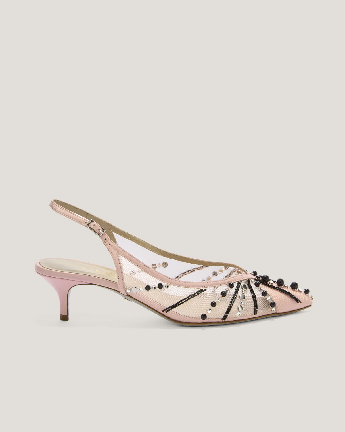 Slingback pumps with a low heel that combine elegance and modernity. Crafted in transparent mesh with leather trims, they are embellished with embroidery and luminous applications of pearls and crystals, creating a refined graphic design. The kitten heel adds comfort and versatility, making them perfect for evening looks or special occasions.
