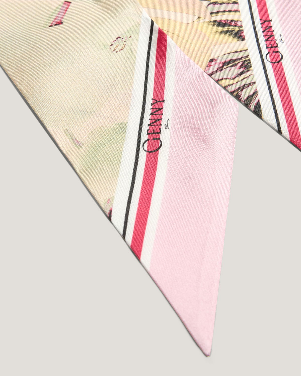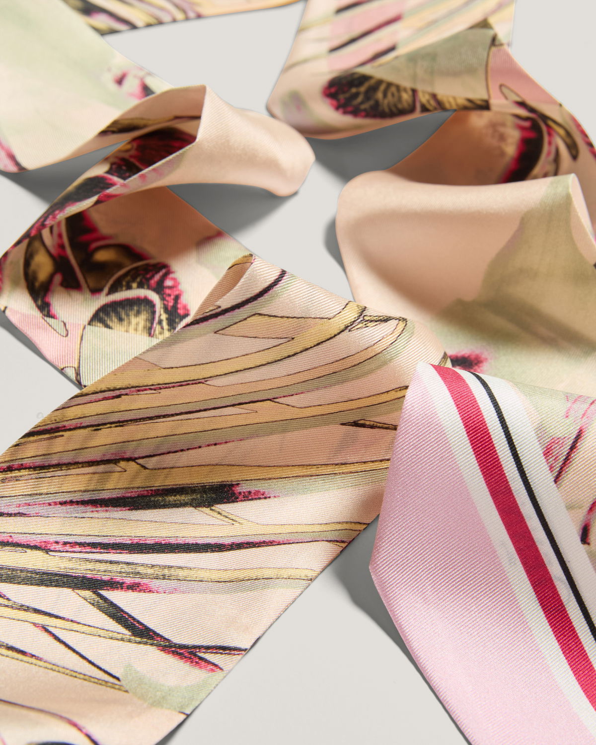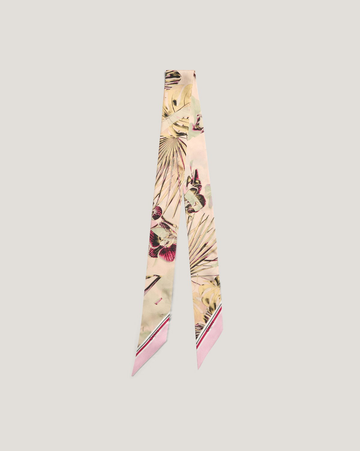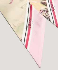 Elegant scarf crafted from pure silk, featuring a Jungle Flower print with natural and floral motifs. The soft and fluid texture of the fabric provides a delicate drape, perfect for enhancing any outfit with a touch of femininity and elegance. The tapered ends give it a modern and versatile look, ideal for wearing around the neck or tied to a bag for a chic and sophisticated detail.
